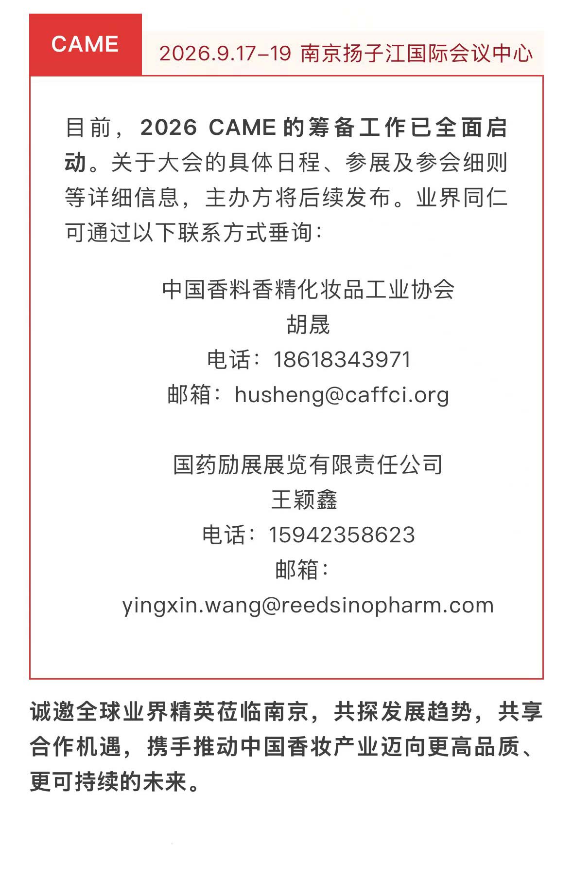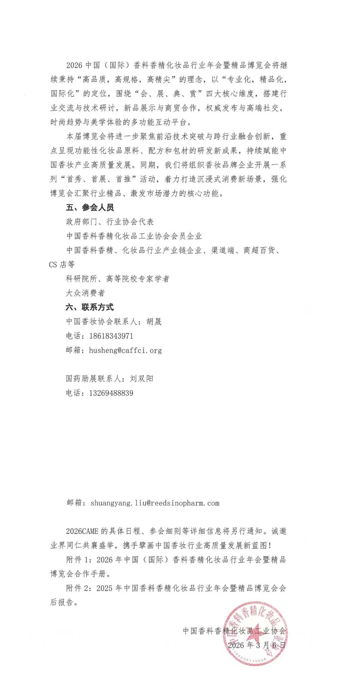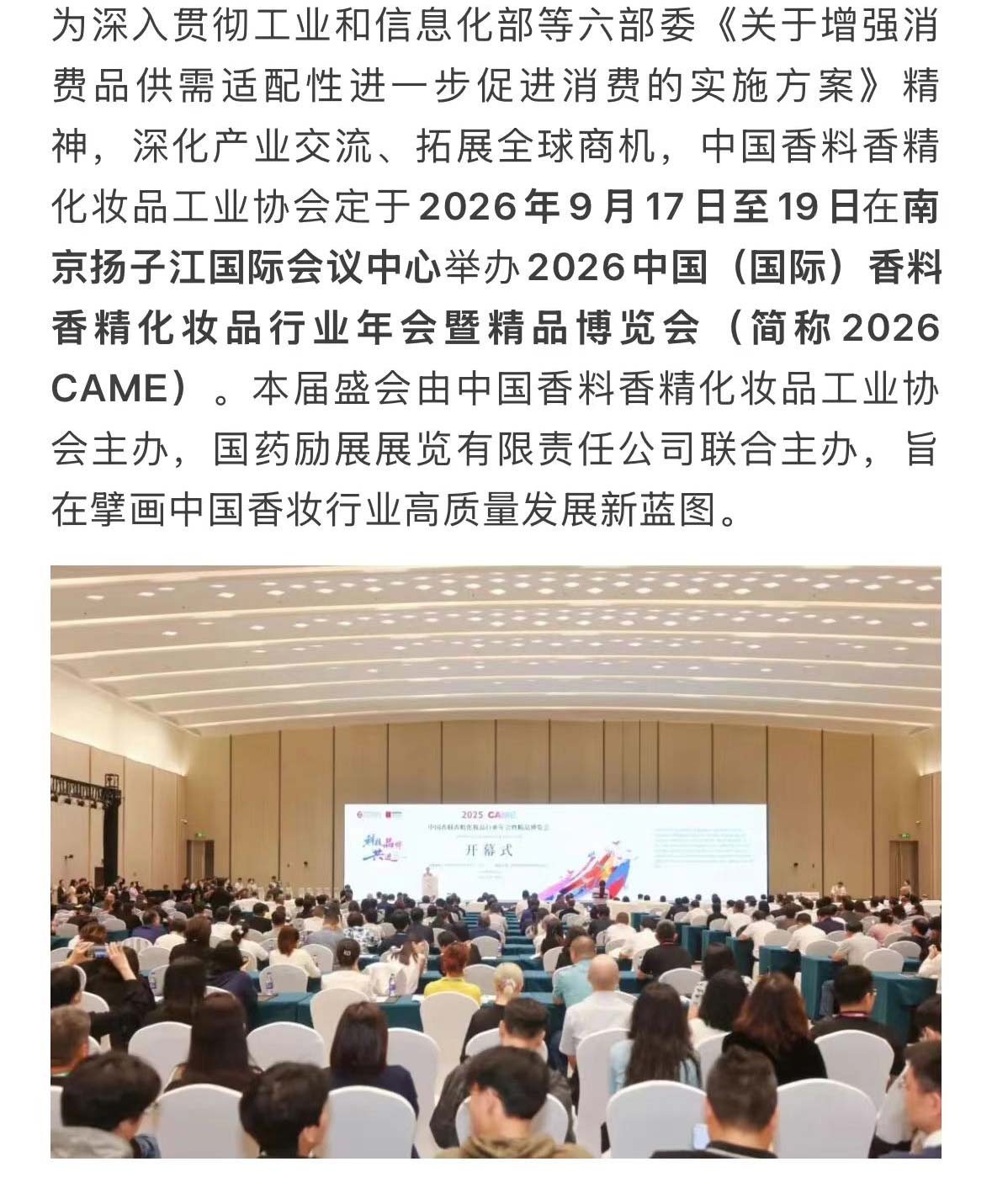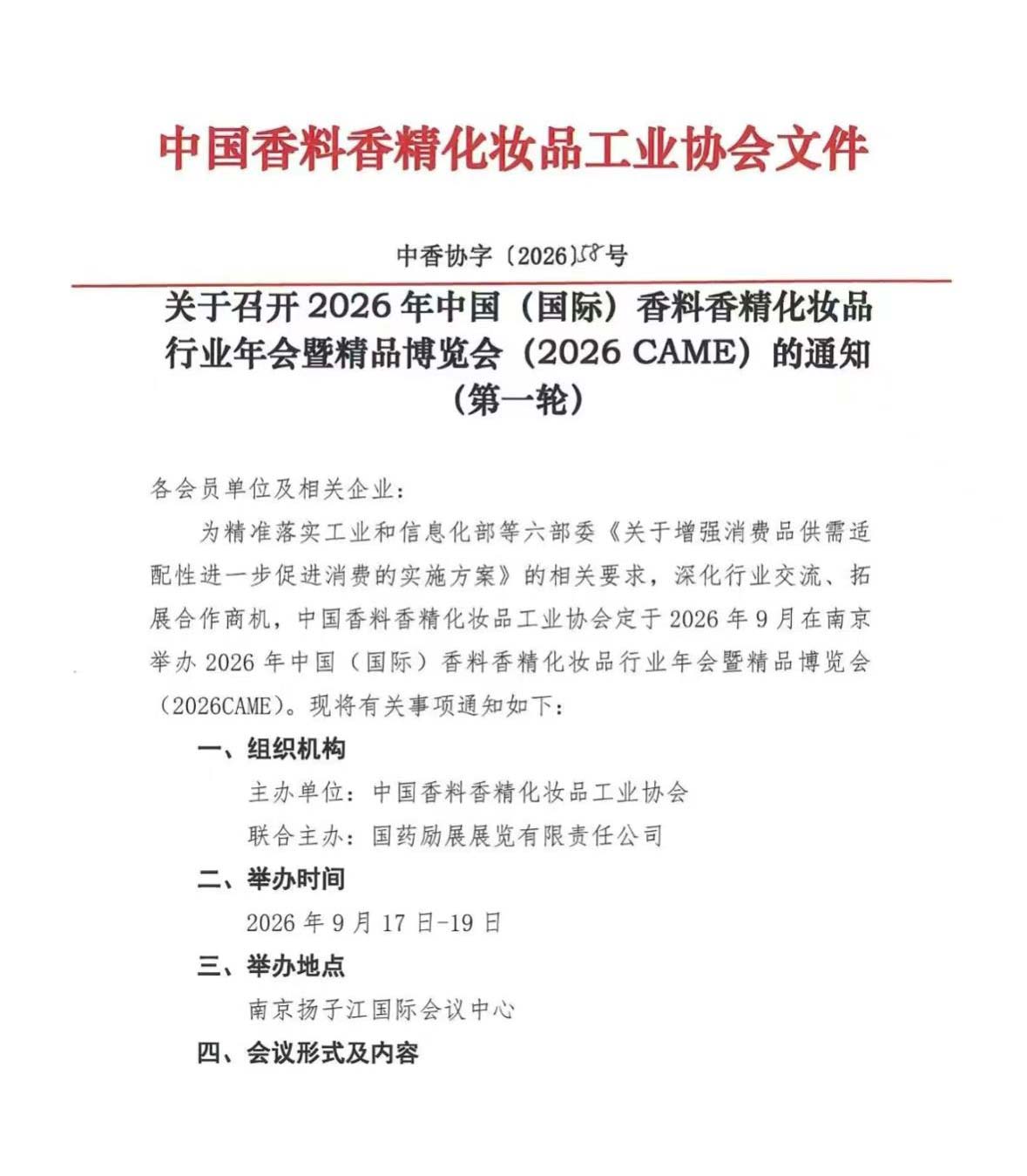 关于召开2026年中国(国际)香料香精化妆品行业年会暨精品博览会(2026 CAME)的通知(第一轮)