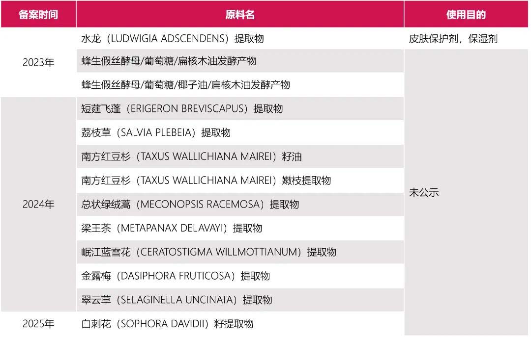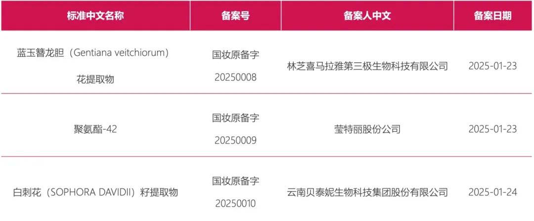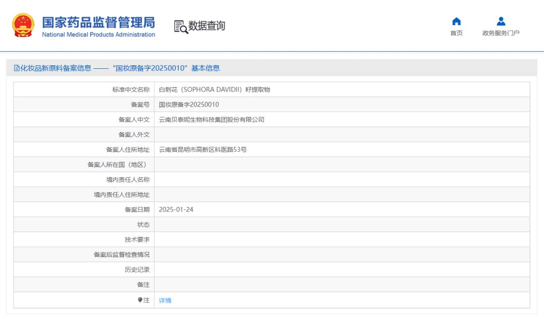 原料信息:白刺花(SOPHORA DAVIDII)籽提取物,备案号为“国妆原备字202500010”,由云南贝泰妮生物科技集团股份有限公司完成备案。