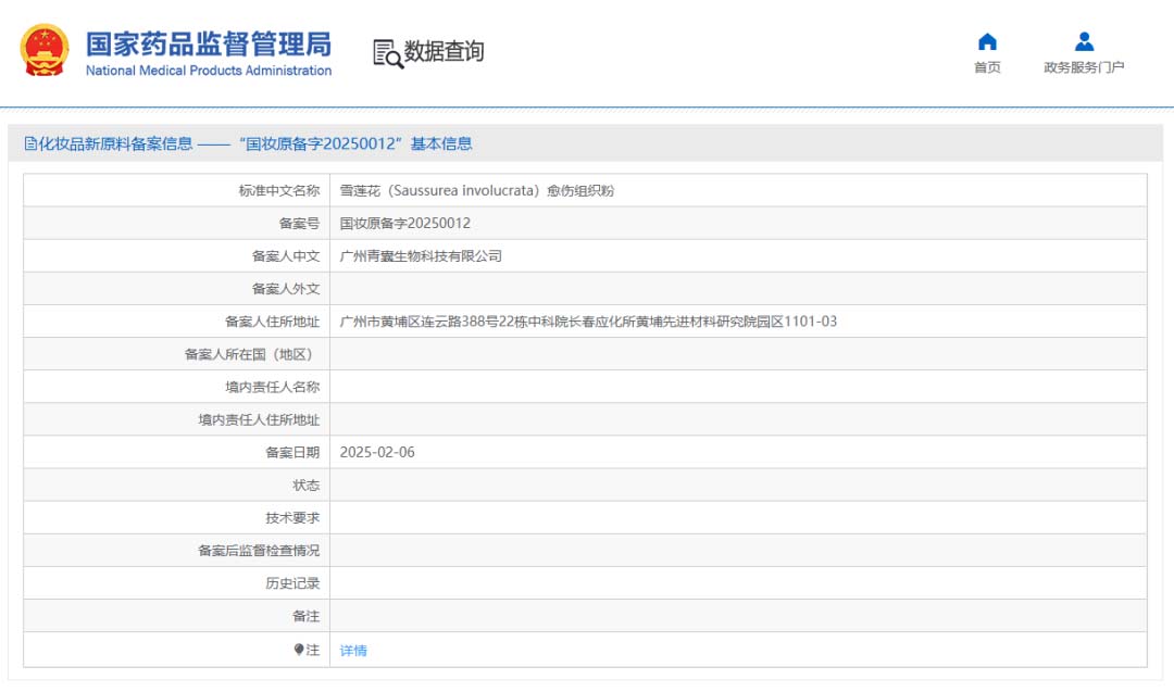 2025 年 2 月 6 日,广州青囊生物科技有限公司成功完成雪莲花(Saussurea involucrata)愈伤组织粉的新原料备案。
