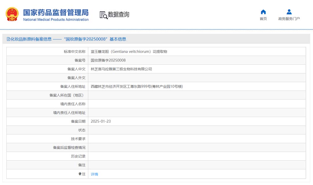 原料信息:蓝玉簪龙胆(Gentiana veitchiorum)花提取物,备案号为“国妆原备字20250008”,由林芝喜马拉雅第三极生物科技有限公司完成备案。