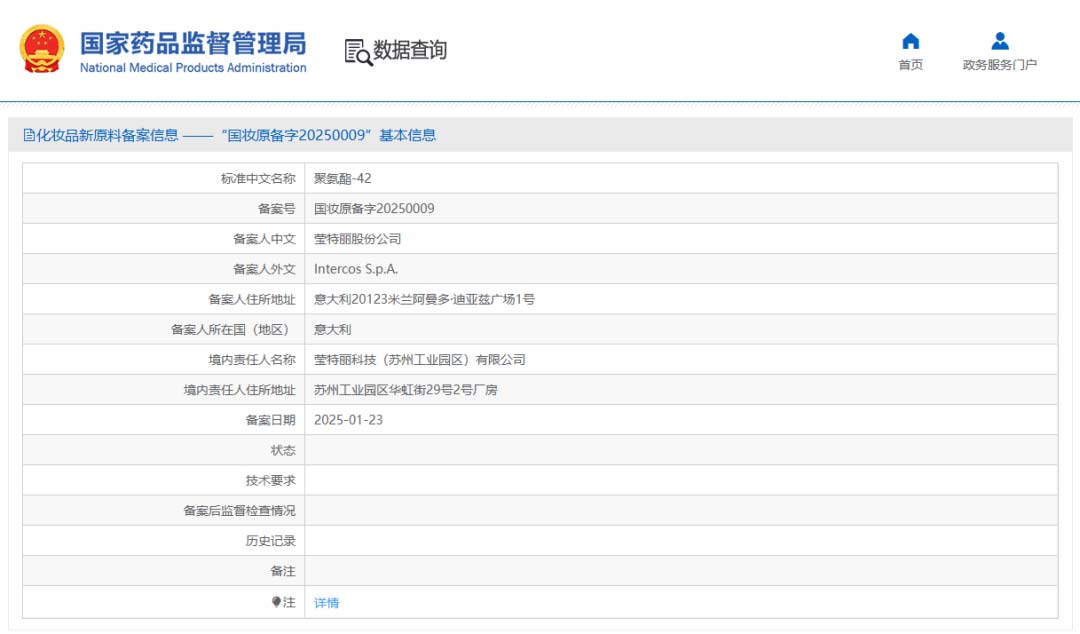 原料信息:聚氨酯-42,备案号为“国妆原备字20250009”,由莹特丽股份公司完成备案。