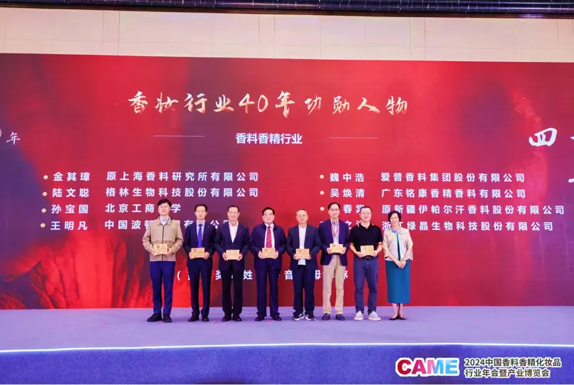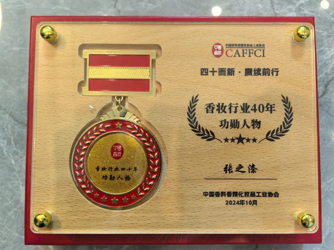 2024 年 10 月 18 日,备受瞩目的 2024 中国香料香精化妆品行业年会暨产业博览会在南京盛大开幕。在此次盛会中,浙江绿晶生物科技股份有限公司董事长张之涤女士凭借其在香妆行业多年来的卓越贡献和杰出成就,被光荣地评为“香妆行业 40 年功勋人物”。