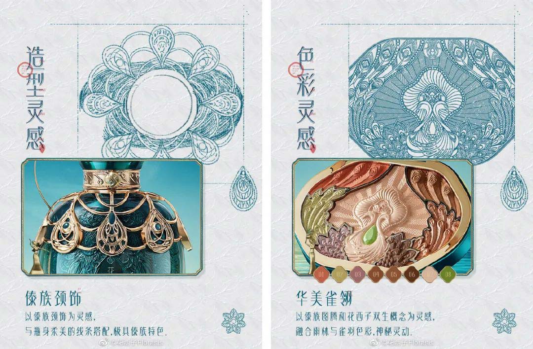 此外,花西子将少数民族元素运用进品牌美学的塑造中,使花西子的东方美更具民族风情,同时在品牌美学意义上,也拓宽了东方美学的范畴。这其中最具代表的就是“傣族印象”与“苗族印象”系列产品。在傣族印象系列产品中,花西子携手中国传统工艺大师袁长君老师,抓住孔雀意象不断延伸创意,把孔雀绿、孔雀花纹、孔雀姿态应用在产品的色彩、包装和花纹中,营造出神秘美丽的傣族风情。