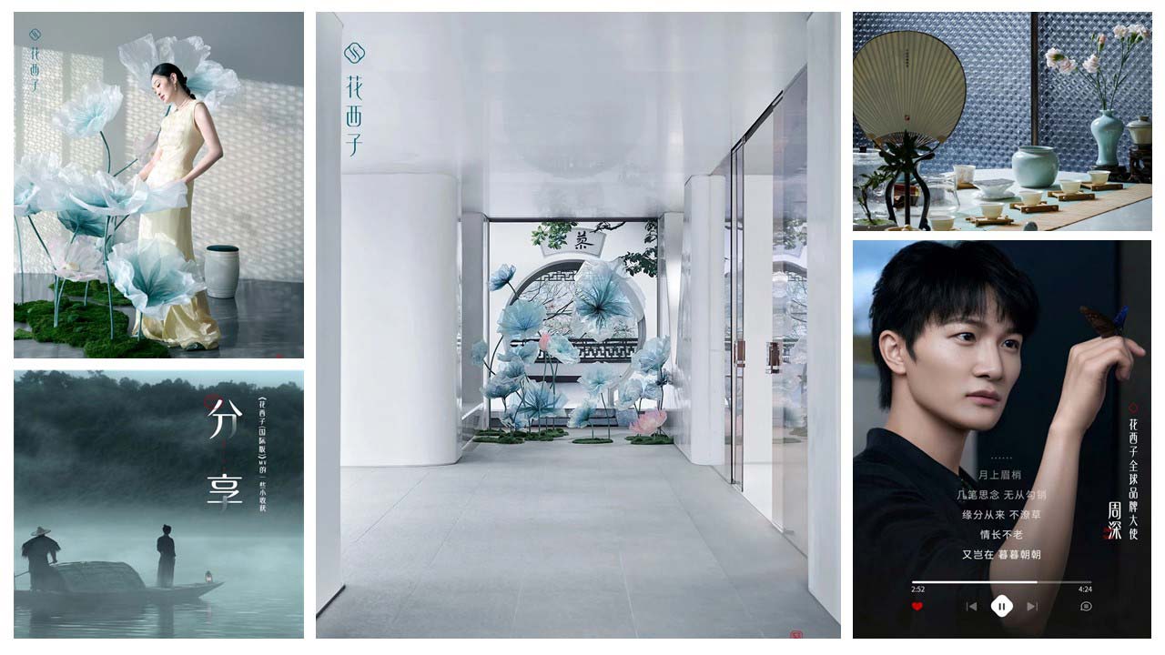 除了依托民族特色助力产品创新外,花西子还搭建了具备东方调性的体验场景“西湖隐园”,邀约具有东方唱腔的歌手周深合作推出主题曲《花西子》,进一步深化品牌文化底蕴。