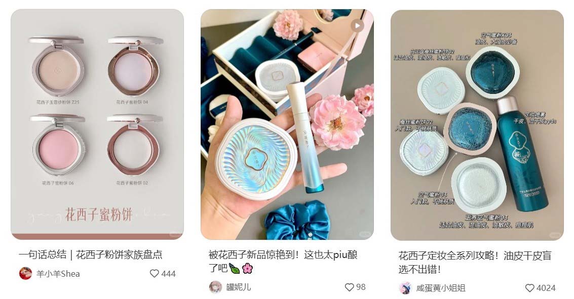 另一方面,花西子在小红书平台寻求KOL进行种草宣传,发布新品测评、晒单种草、美妆教程等内容,触达各个圈层的消费者。花西子与不同领域的品牌进行跨界联名,例如酒类品牌泸州老窖、服饰品牌盖娅传说等,极大地提升品牌传播力与影响力。