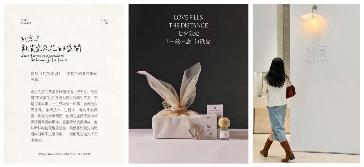 在营销宣传方面,观夏采用文学和艺术性的表达方式,在社交平台讲述故事,搭好场景,传递品牌情怀;结合节日营销,在「七夕」、「情人节」、「春节」等节点推出限定产品或礼盒,如七夕“西溪桃花”限定礼盒;在线下店,观夏日常联动各界艺术家,举办「人文艺术展览」,丰富品牌文化,提升品牌整体质感。