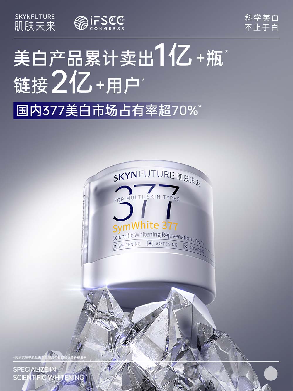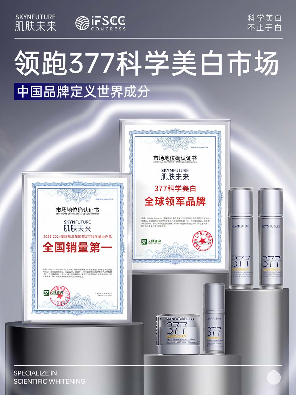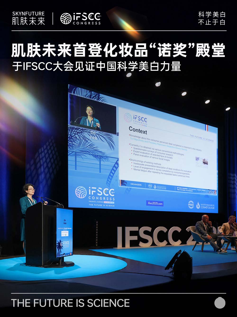 本届大会以“The Future is Science”为主题,与科学美白专研品牌肌肤未来“无限探索、无限进化”的品牌基因高度契合。肌肤未来不仅以双项科研创新成果闪耀亮相,更作为“个性化美容科技”板块唯一受邀登台分享的中国品牌,向世界展示了中国品牌在肤色科学研究领域的前沿突破,更揭秘了其明星大单品二代377面霜畅销神话背后的科研进化论。