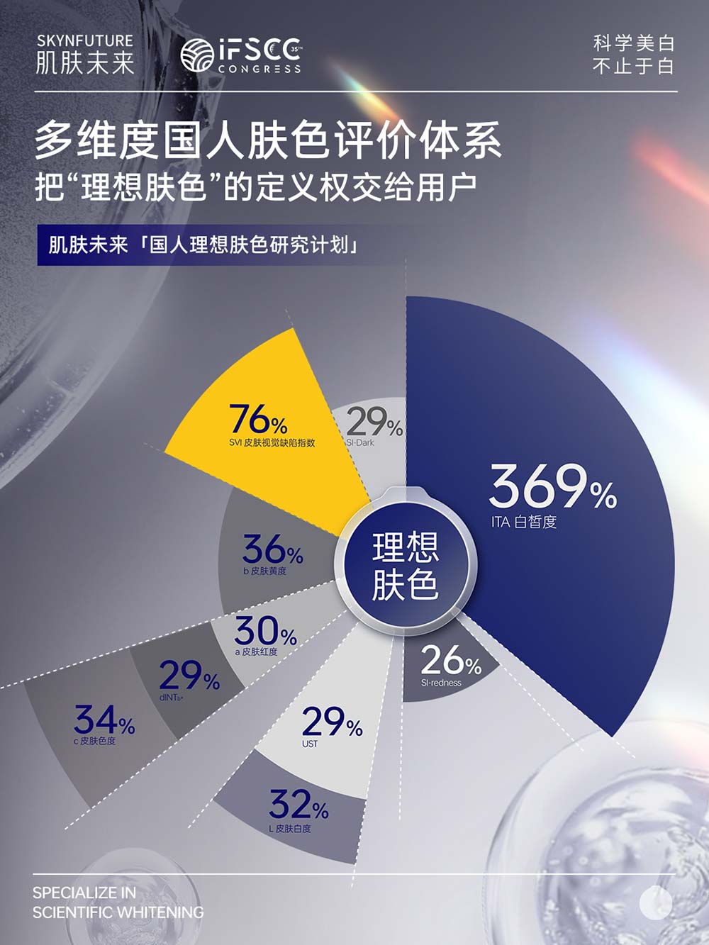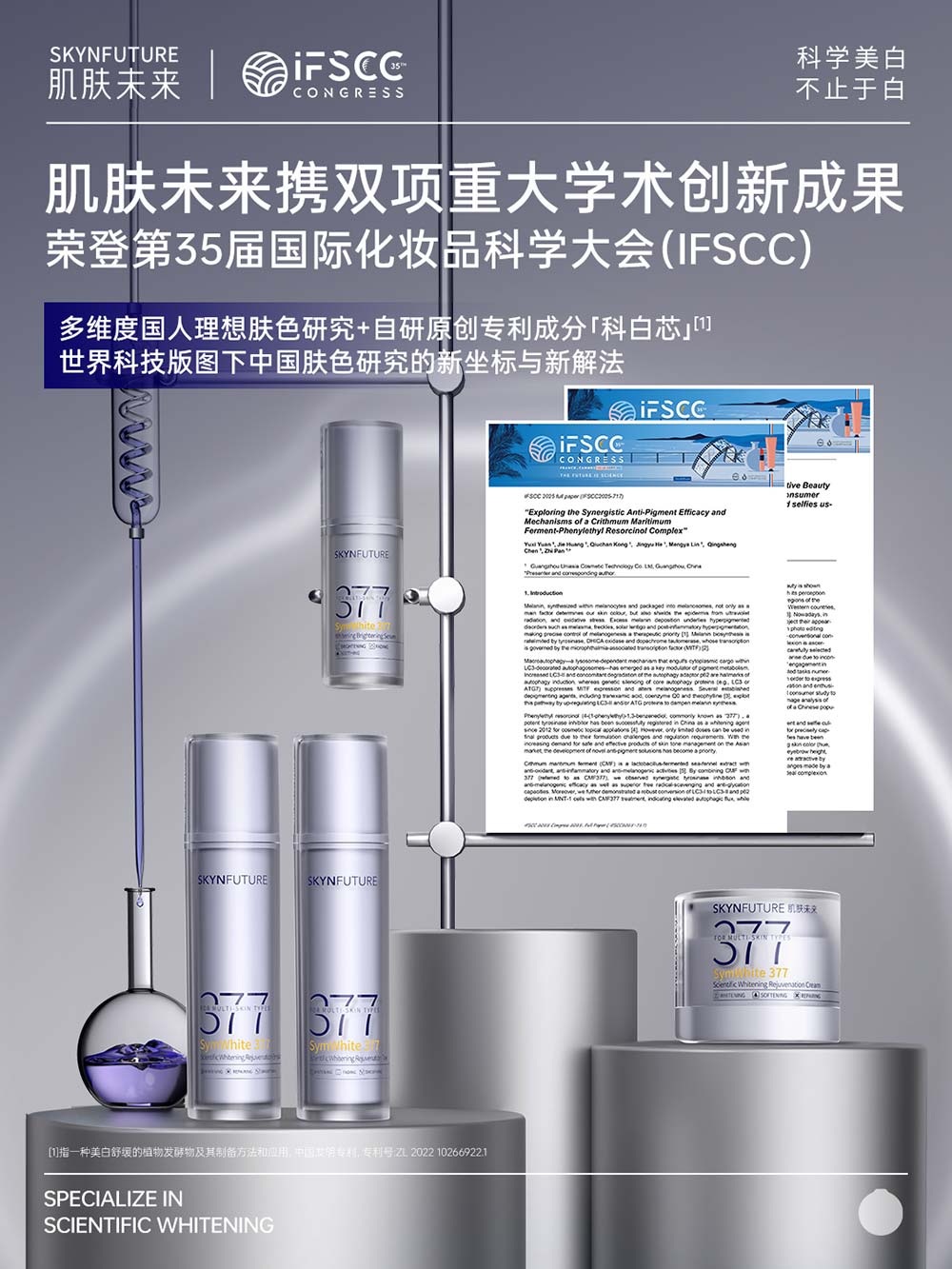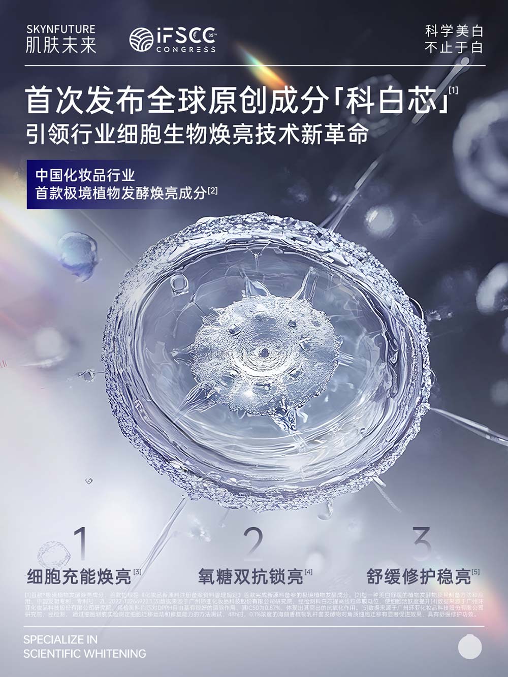首次亮相IFSCC国际舞台,肌肤未来便以两项极具前瞻性与突破性的研究成果,充分展现了品牌的科研实力与战略格局——不仅系统性展示了国人多维度理想肤色的研究成果,提出“科学美白,不止于白”的全新品牌主张;更以首度公开的独家自研专利成分「科白芯」[4]的作用机制与功效验证,诠释品牌从深度洞察到独家解法的完整科研链路。这两项成果不仅是肌肤未来七年专注科研的阶段性答卷,更是品牌引领未来美白趋势的坚定宣言。