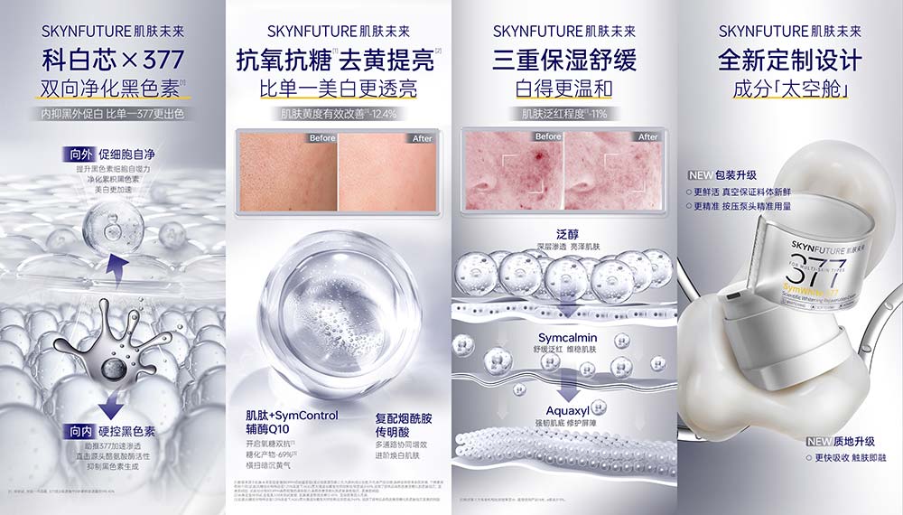肌肤未来自主研发核心成分「科白芯」携手377,从源头改善肌肤代谢环境,提升细胞活力、激活黑素自净机制,赋予肌肤持续抵御暗沉与净黑焕亮的能力,从而由内而外呈现出更加理想健康的肤色。这不仅是一个成分的创新,更是肌肤未来对“理想肤色”的科学解答:帮助每一位用户告别肤色焦虑,温和、持久、自然地焕发专属光采。