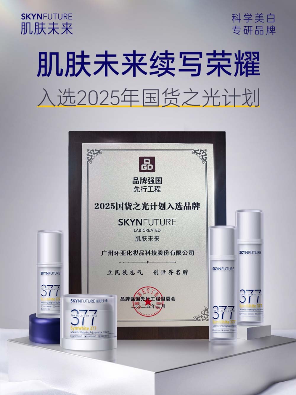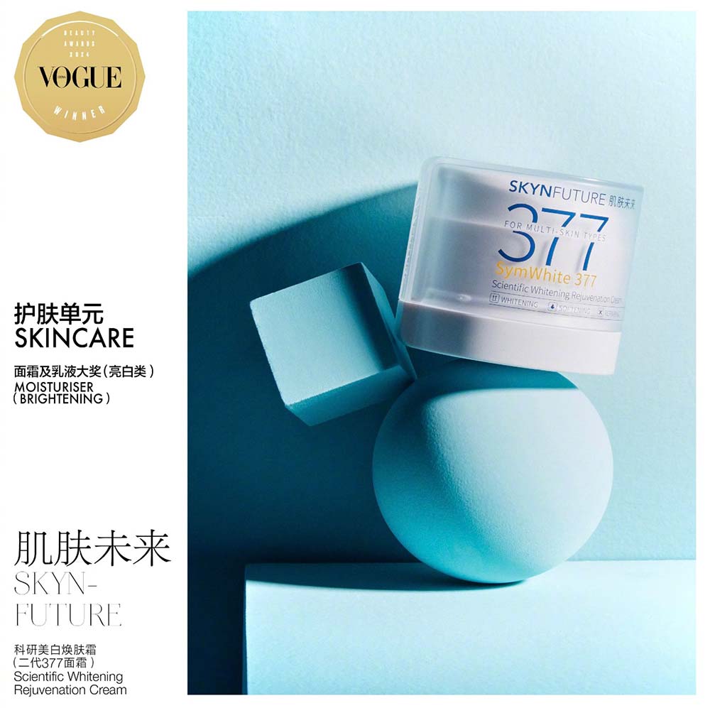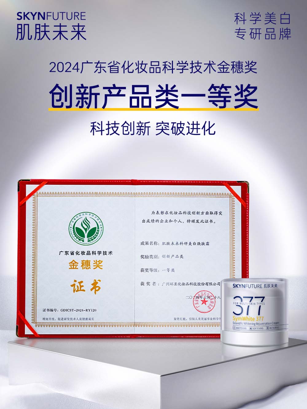 因其突破创新的功效技术,二代377面霜被广东省化妆品科学技术研究会授予「金穗奖创新产品类一等奖」。