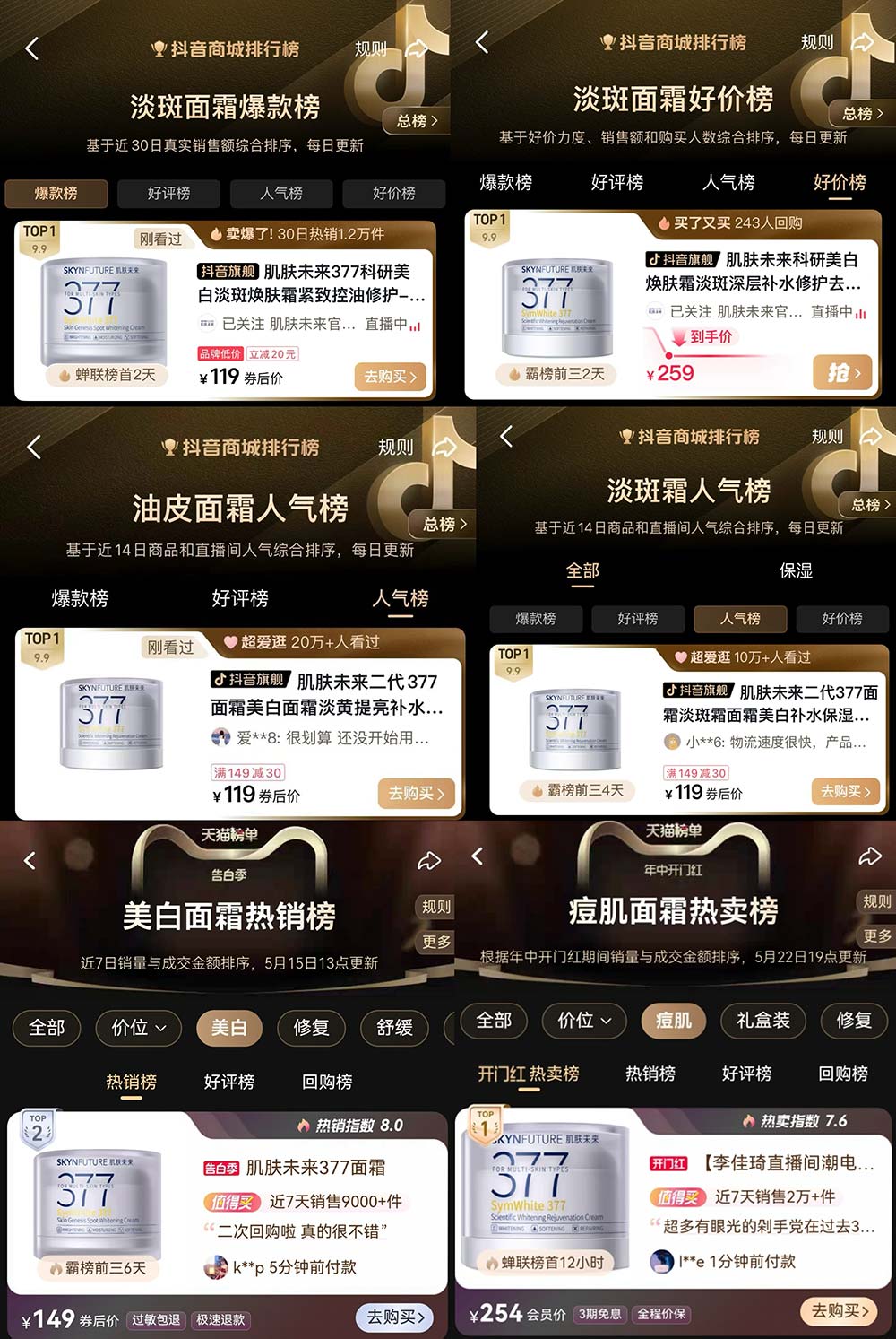 市场是最公正的试金石——肌肤未来二代377面霜首发7天便售出超40000瓶[12]。天猫、抖音、京东等六大电商平台同步引爆,上线即登顶「爆款棒TOP1」「人气榜TOP1」「热卖榜TOP1」等各大榜单,用市场实力验证了何为 “新品即爆品,出场即高光”。 其强大硬核的产品力以及前瞻的需求洞察力,都得到了用户的高度认可——在社交媒体上,#377
