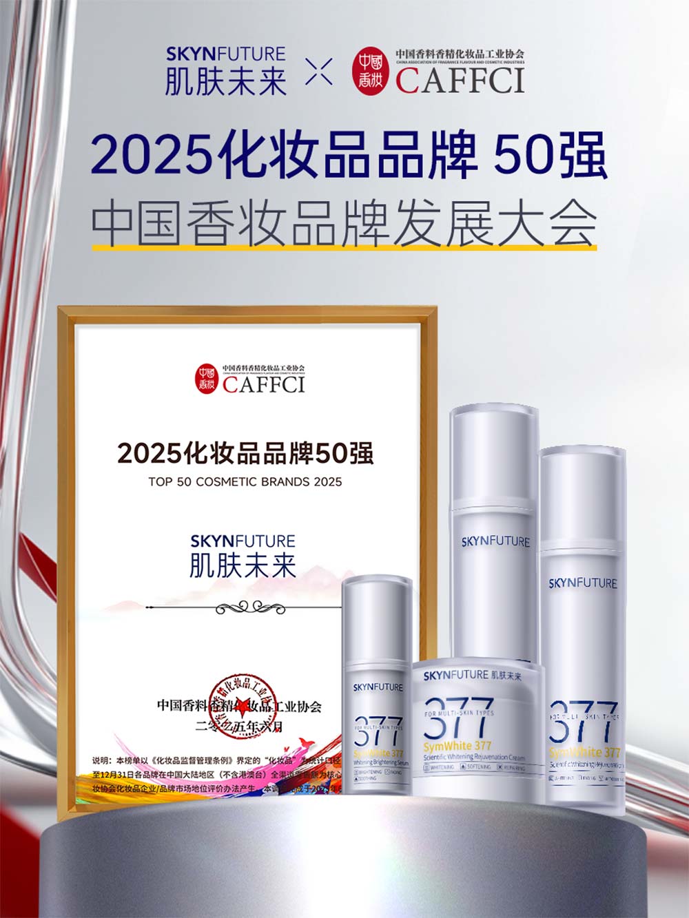 肌肤未来凭借卓越产品力,已连续三年稳居「国货377科学美白产品全国销量第一」[13],无愧于「377科学美白领军品牌」的称号。品牌不仅成功入选国家级「国货之光」计划,更荣获中国香精化妆品工业协会“2025年度化妆品品牌50强”等多项权威大奖。这些成绩,是销量与口碑的双重见证,更是行业与市场对品牌科技力与影响力的高度认可。