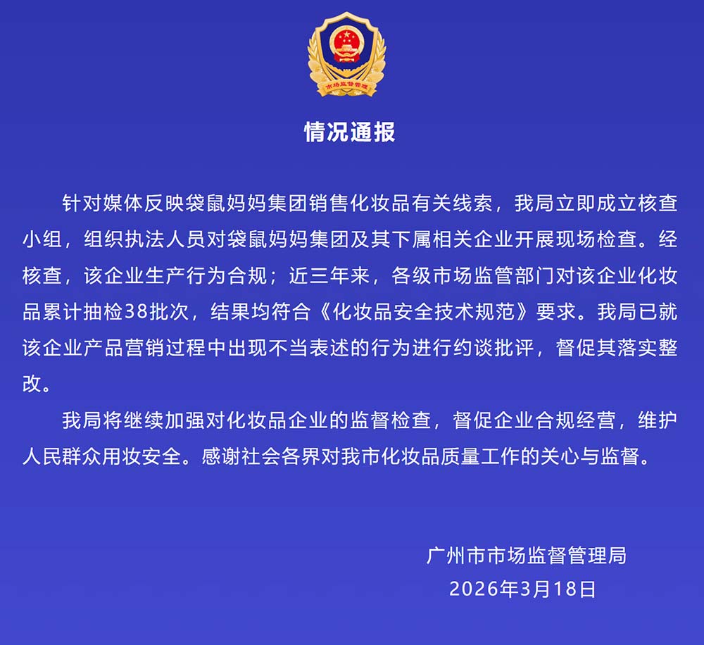 日,广州市市场监督管理局的官方微信公众号“广州市场监管”发布了一则《情况通报》。据该通报内容,袋鼠妈妈集团企业生产行为合规;近三年来,各级市场监管部门对该企业化妆品累计抽检
