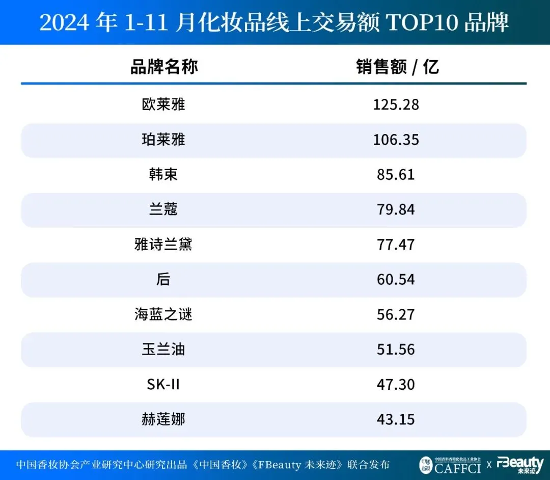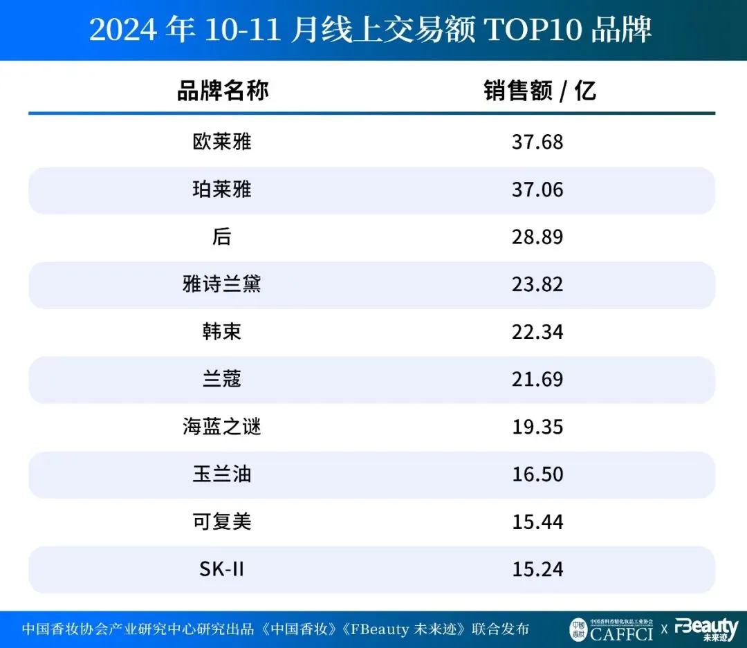 10-11月,珀莱雅和欧莱雅的销售额差距缩小到不足6000万元;可复美则由于双11期间销量爆发,首次进入线上销售额前十。