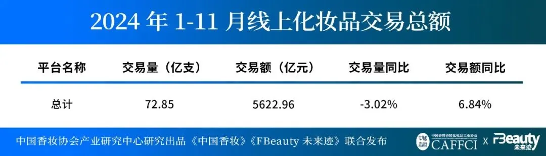 1-11月,淘宝+天猫、京东、抖音、快手、拼多多5大线上平台的化妆品交易总额约为5622.96亿元,同比增长6.84%;但交易量下滑了3.02%。