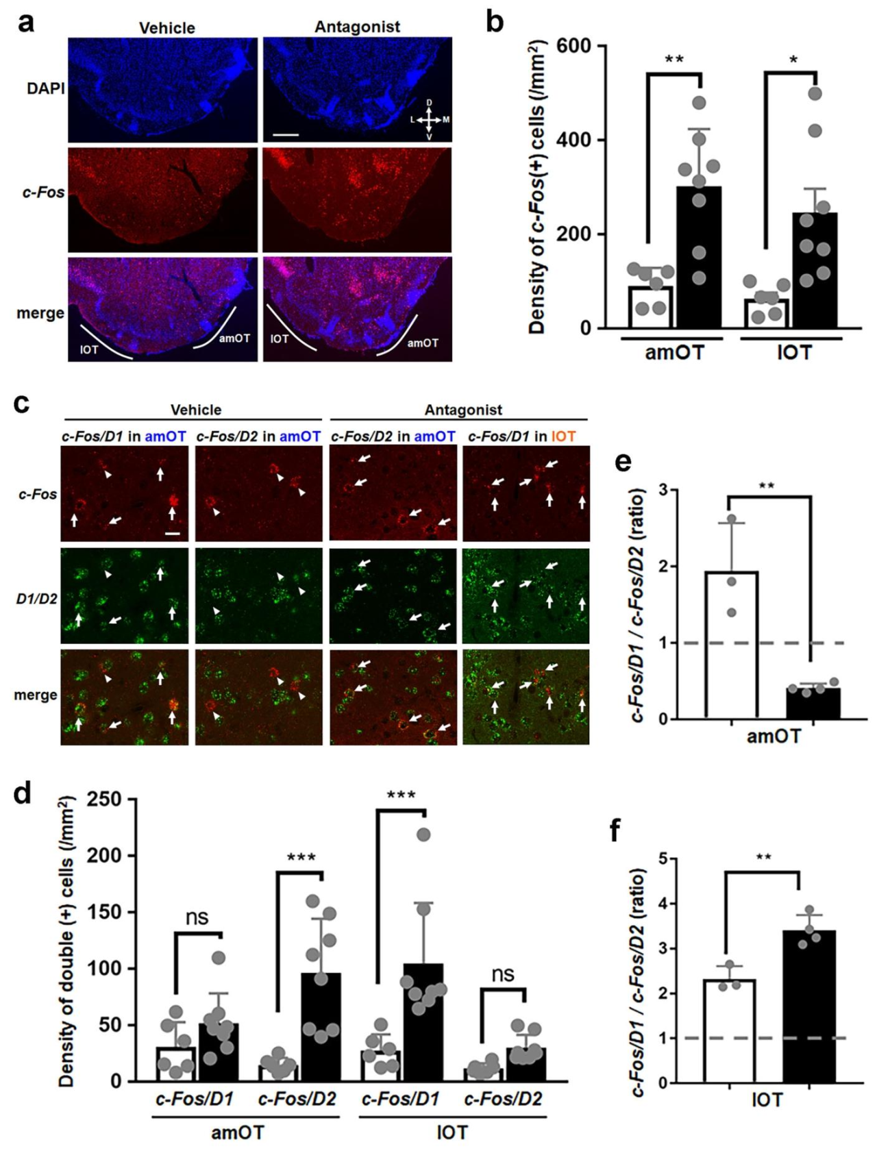 那这个“小把手”是怎么起作用的呢?科研人员通过对小鼠大脑进行组织学分析和原位杂交实验,发现注射拮抗剂后,小鼠amOT里促进厌恶行为的D2细胞被激活,而lOT里促进吸引行为的D1细胞被激活(图6)。这就解释了为什么小鼠的行为会发生那么大的变化。