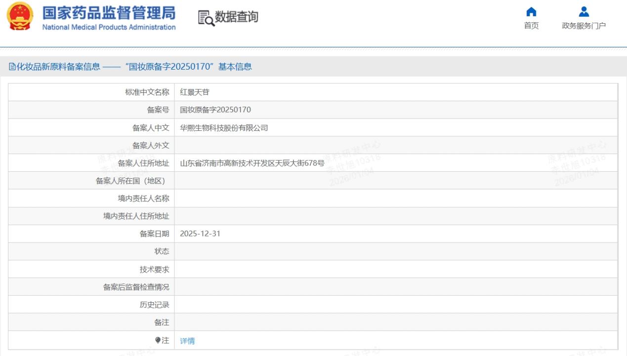 华熙生物完成红景天苷的化妆品新原料备案,备案号为国妆原备字20250170,使用目的为皮肤保护剂和抗氧化剂。