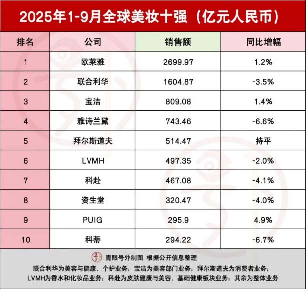 就排名来看,今年前三季度,欧莱雅集团以2700亿元的销售额继续断层领先,且是唯一一家销售额突破2000亿元的公司。