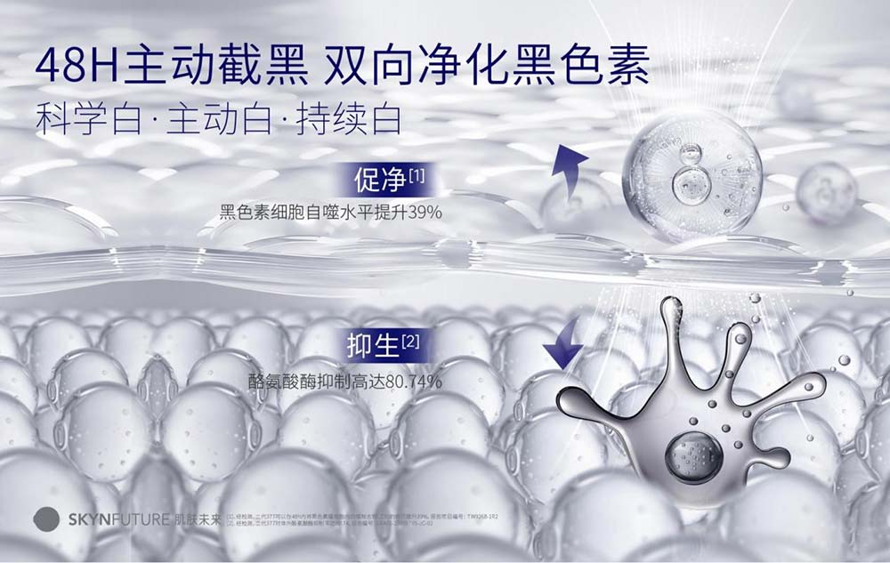 肌肤未来研发团队并未局限于单一维度的优化,而是从机制层面入手,重构美白路径,通过多通路、多维度的协同作用,系统性地解决传统成分在应用中的兼容难题。