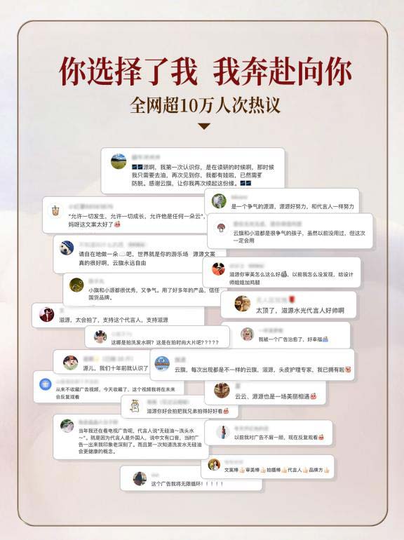 在预热发布之初,评论区便被粉丝热情的留言包围——“居然是滋源!从小用到大的国民品牌,这波合作就是强强联合”、“洗了一辈子头发,你洗过头皮吗?这句slogan太有记忆度了”“这瓶不就是我在用的吗?“……随着传播的深入,各个社交平台俨然变成了“滋源新老用户交流会”。粉丝们纷纷在评论区晒出自己曾经用过的滋源产品,这种基于真实产品口碑的UGC自发传播,让原本单向的明星宣发成为品牌资产的焕新。