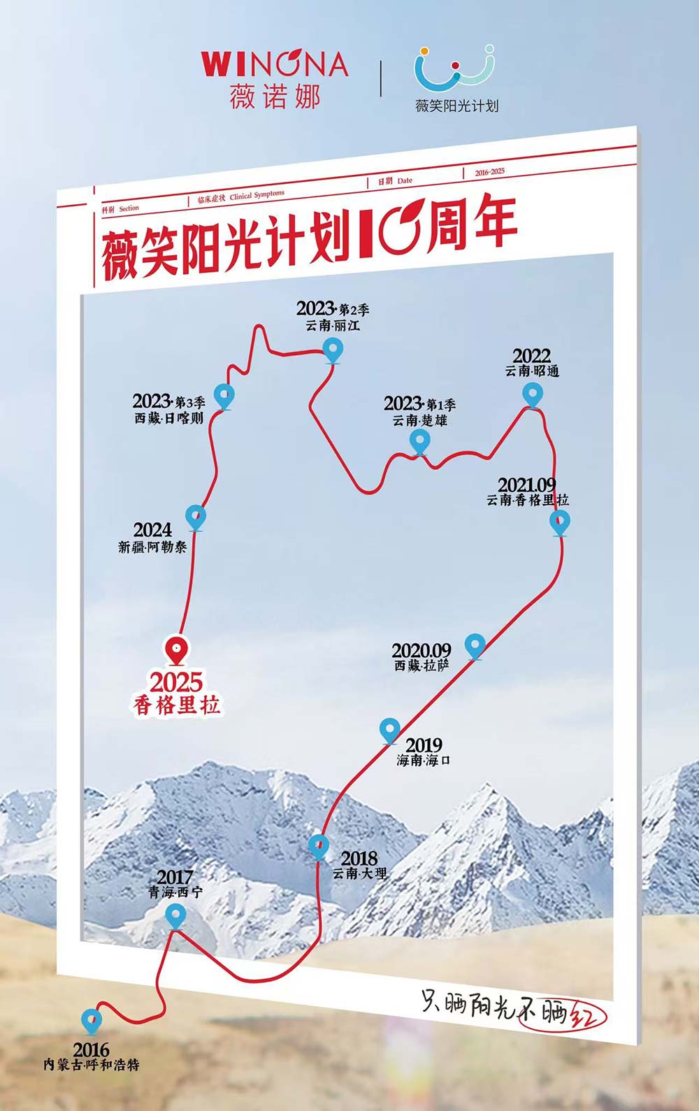 从2016年内蒙古呼和浩特开始,“薇笑阳光计划”穿越青海西宁、云南大理、海南海口、西藏拉萨、云南昭通、楚雄、丽江、西藏日喀则、新疆阿勒泰,直通云南香格里拉,足迹遍布中国紫外线最强区域。十年间,这项公益行动已然勾勒出一幅壮阔的足迹图。