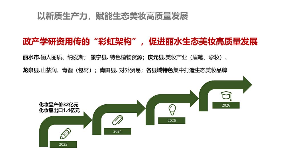 在演讲中,颜江瑛博士表示,用政产学研资用传的“彩虹架构”来促进丽水生态美妆高质量发展,比如:丽水市是俪人丽质、纳爱斯,景宁县是特色植物资源聚集地,庆元县是美妆产业(眉笔、彩妆),龙泉县是山茶润、青瓷(包材),青田县是对外贸易,等等。各县域特色集中打造生态美妆品牌。