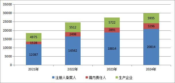 图1 2021年至2024年化妆品注册人备案人、境内责任人和生产企业数据图