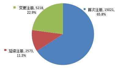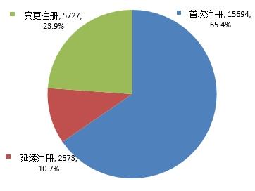 按照注册申请类别区分,首次注册15694件,占全部注册申请的65.4%;延续注册2573件,占全部注册申请的10.7%;变更注册5727件,占全部注册申请的23.9%。注册申请类别情况见图3。
