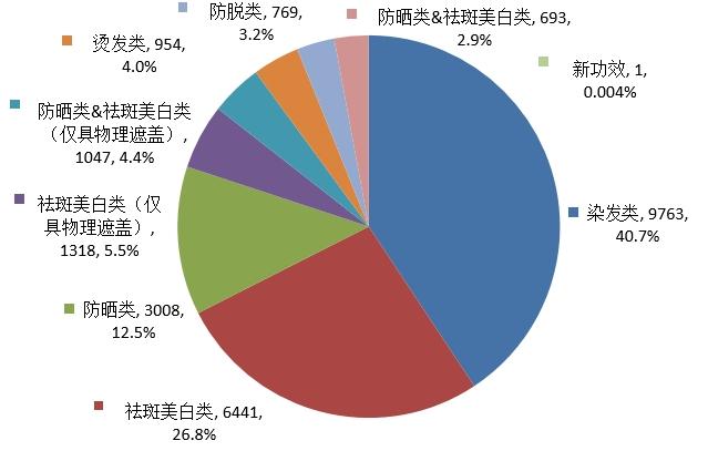 按照注册申请产品类型区分,染发类9763件,占全部注册申请的40.7%;祛斑美白类6441件,占全部注册申请的26.8%;防晒类3008件,占全部注册申请的12.5%;其他类型合计4782件,占20.0%。注册申请产品类型情况见图4。