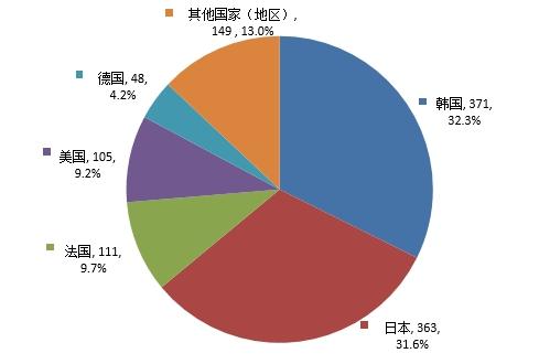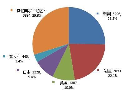 受理进口首次注册1147件,涉及16个国家(地区),申请数量排名前5依次为韩国、日本、法国、美国、德国,申请数量排名前5合计占进口首次注册化妆品的87.0%,相关情况见图6。