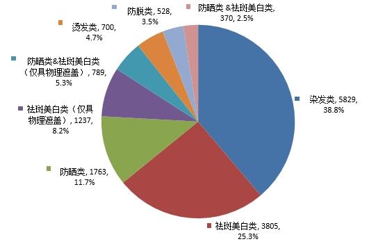 首次注册按照注册申请产品类型区分,染发类5829件,占全部注册数量的38.8%;祛斑美白类3805件,占全部注册数量的25.3%;防晒类1763件,占全部注册数量的11.7%;其他类型合计3624件,占24.1%。首次注册申请产品类型情况见图9。