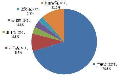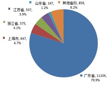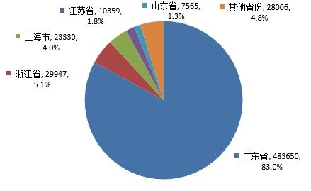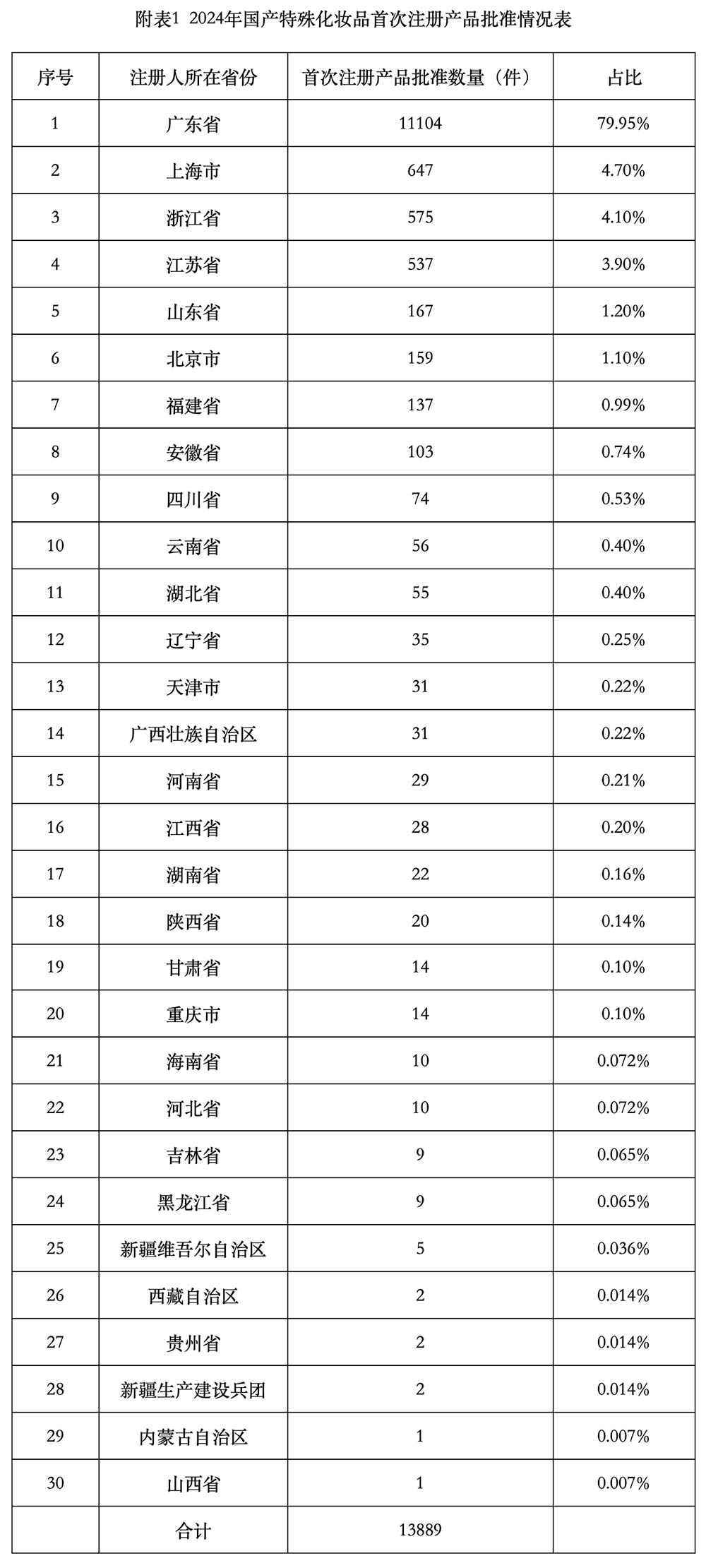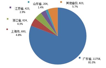 批准国产首次注册13889件,其中,广东省、上海市、浙江省、江苏省、山东省是国产首次注册申请数量排名前5的省份,合计占国产首次注册的93.8%,国产首次注册产品情况见图10和附表1。