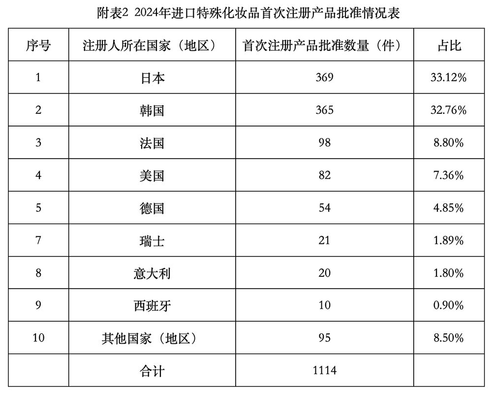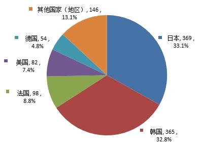 批准进口首次注册1114件,涉及15个国家(地区),批准数量排名前5依次为日本、韩国、法国、美国、德国,批准数量排名前5合计占进口首次注册化妆品的86.9%,进口首次注册产品情况见图11和附表2。