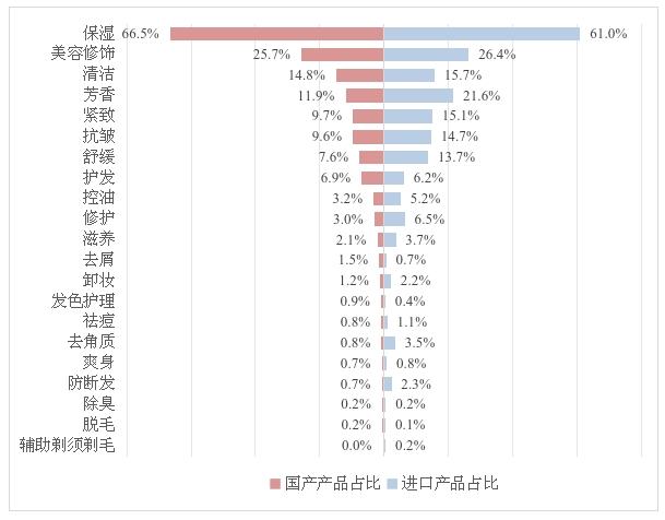 按功效宣称区分,2024年国产普通化妆品备案数量前三位分别为保湿类(66.5%)、美容修饰类(25.7%)和清洁类(14.8%),进口普通化妆品备案数量前三位分别是保湿类(61.0%)、美容修饰类(26.4%)和芳香类(21.6%),相关数据详见图15。(注:部分产品宣称具有两个及以上功效)。