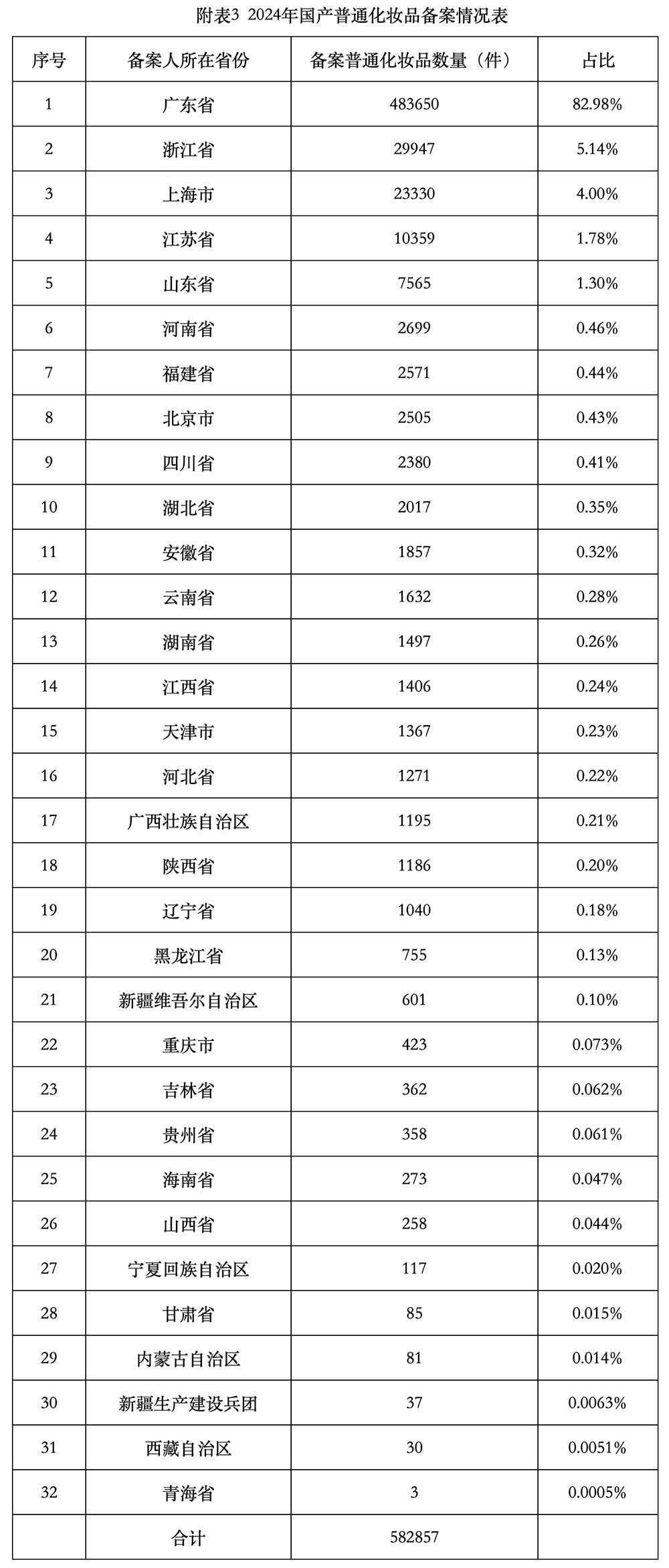 2024年,广东省、浙江省、上海市、江苏省、山东省是国产备案产品数量排名前5的省份,备案产品数量合计占国产普通化妆品95.2%,国产普通化妆品备案情况见图12和附表3。