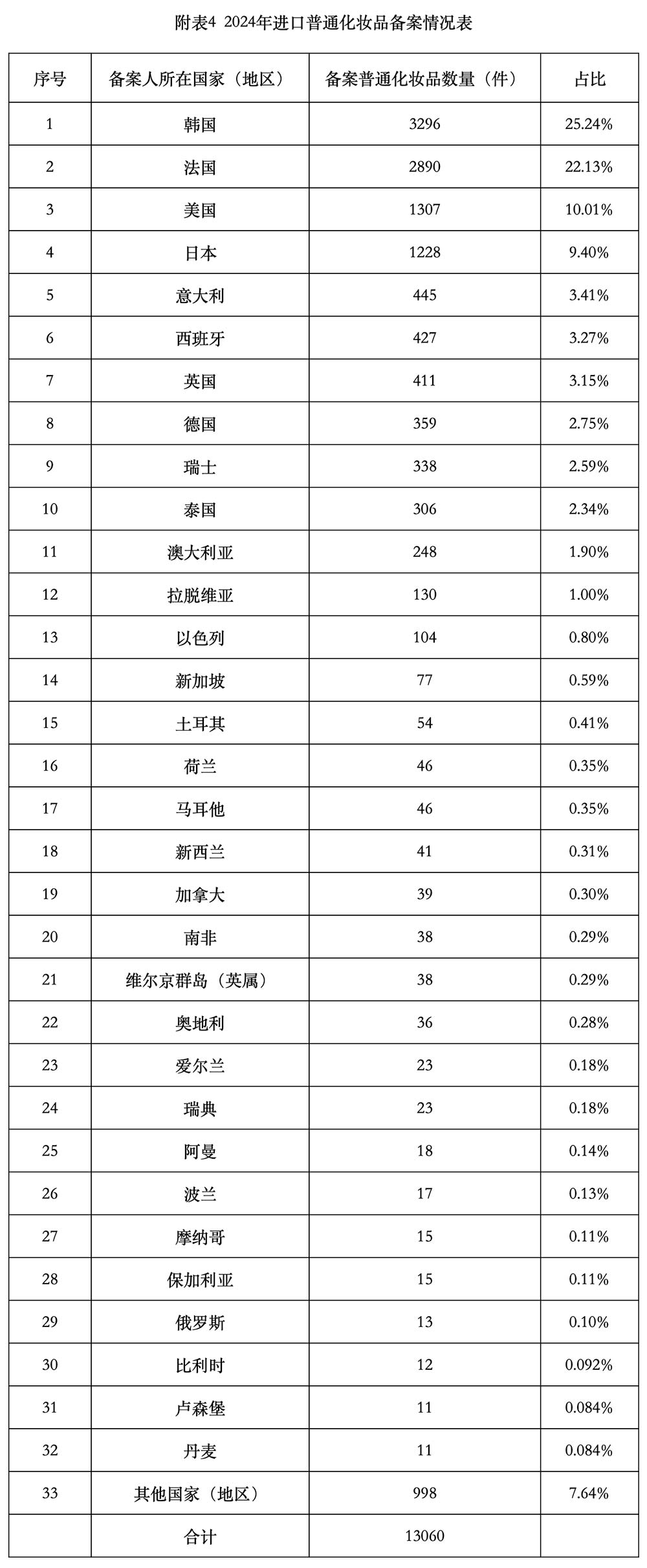 2024年,进口普通化妆品涉及45个国家(地区),备案产品数量排名前5依次为韩国、法国、美国、日本、意大利,备案产品数量排名前5合计占进口普通化妆品的70.2%,相关情况见图14和附表4。