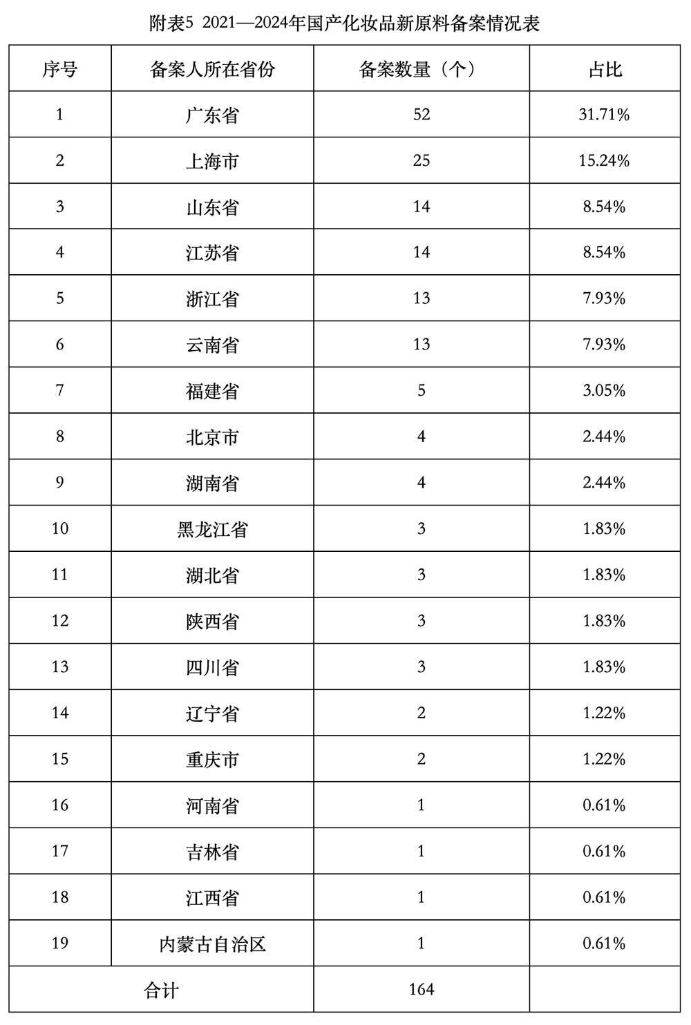 广东省、上海市、山东省、江苏省、浙江省和云南省(并列)是国产新原料备案数量前5的省份,合计占国产备案新原料数量的79.9%,相关情况见附表5。