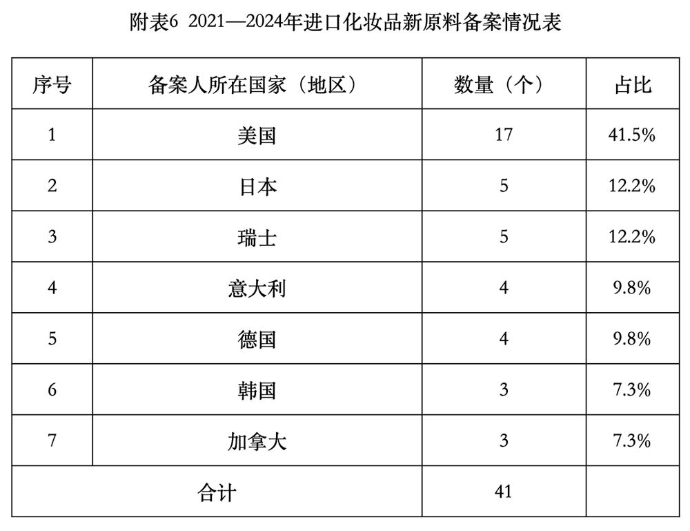 进口备案新原料涉及7个国家,美国、日本、瑞士、意大利、德国是进口新原料备案数量前5的国家,合计占进口备案新原料数量的85.4%,相关情况见附表6。