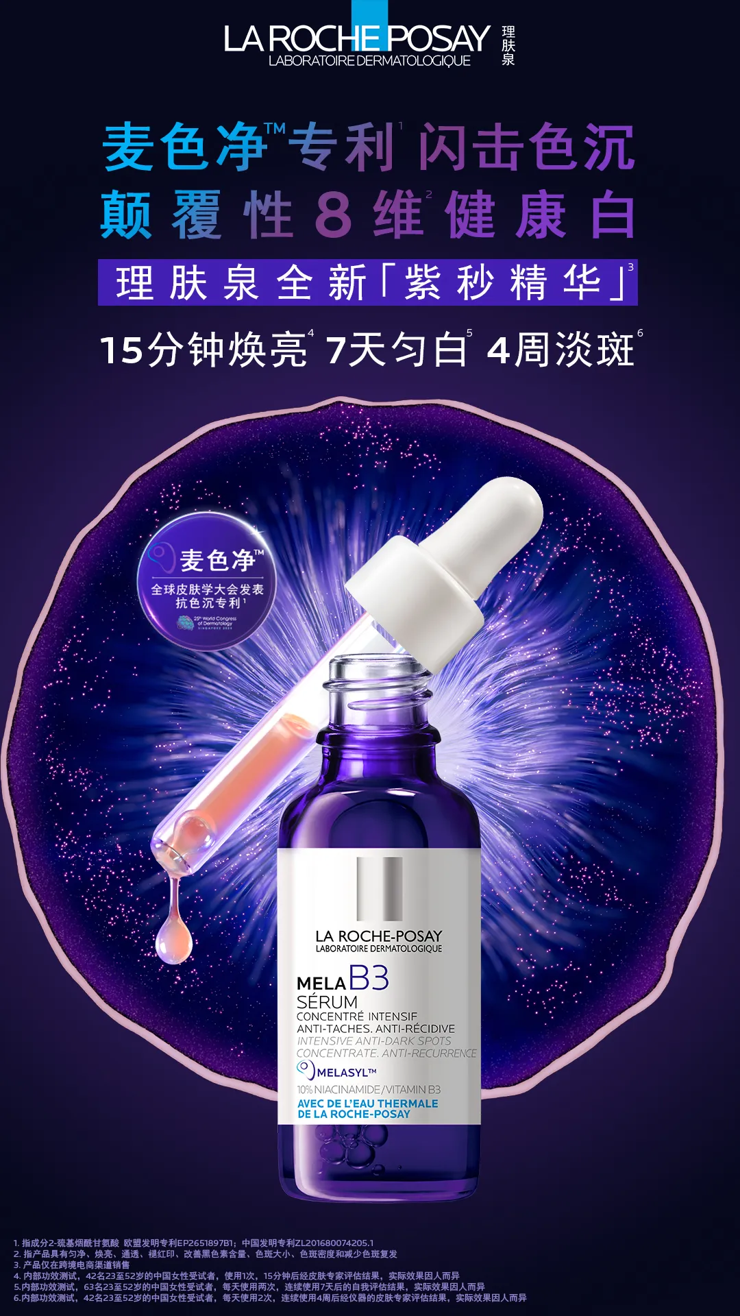 1)突破性成分麦色净TM中国首发:欧莱雅集团用于解决局部皮肤色素沉着的突破性专利成分,历经18年的研发,是通过121 项科学研究、多重严格测试的成果。该成分创新性地可在黑色素转化为色素之前,捕捉其前体,从而抑制黑色素的合成,改善色素紊乱问题,淡化皮肤色素斑点、改善皮肤外观,甚至是最顽固的斑点,安全有效。