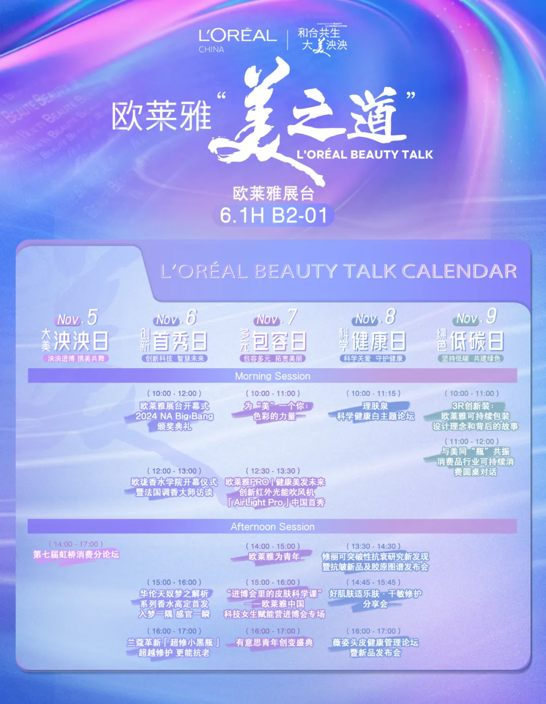 除了带来新品的首发首秀,欧莱雅也在进博会充分联动各方,推进行业内和跨行业的交流与合作,携手生态圈美美与共,共享发展机遇。今年,欧莱雅全新升级 “美之道Beauty Talk”系列对话,充分整合集团和品牌的新投资、新合作,倾情呈现十余场丰富活动——