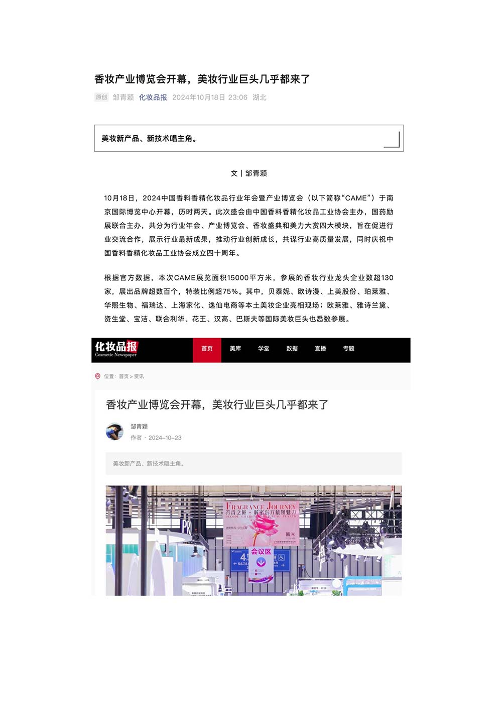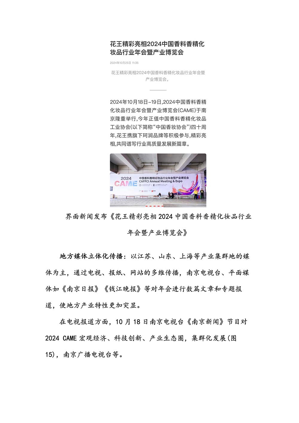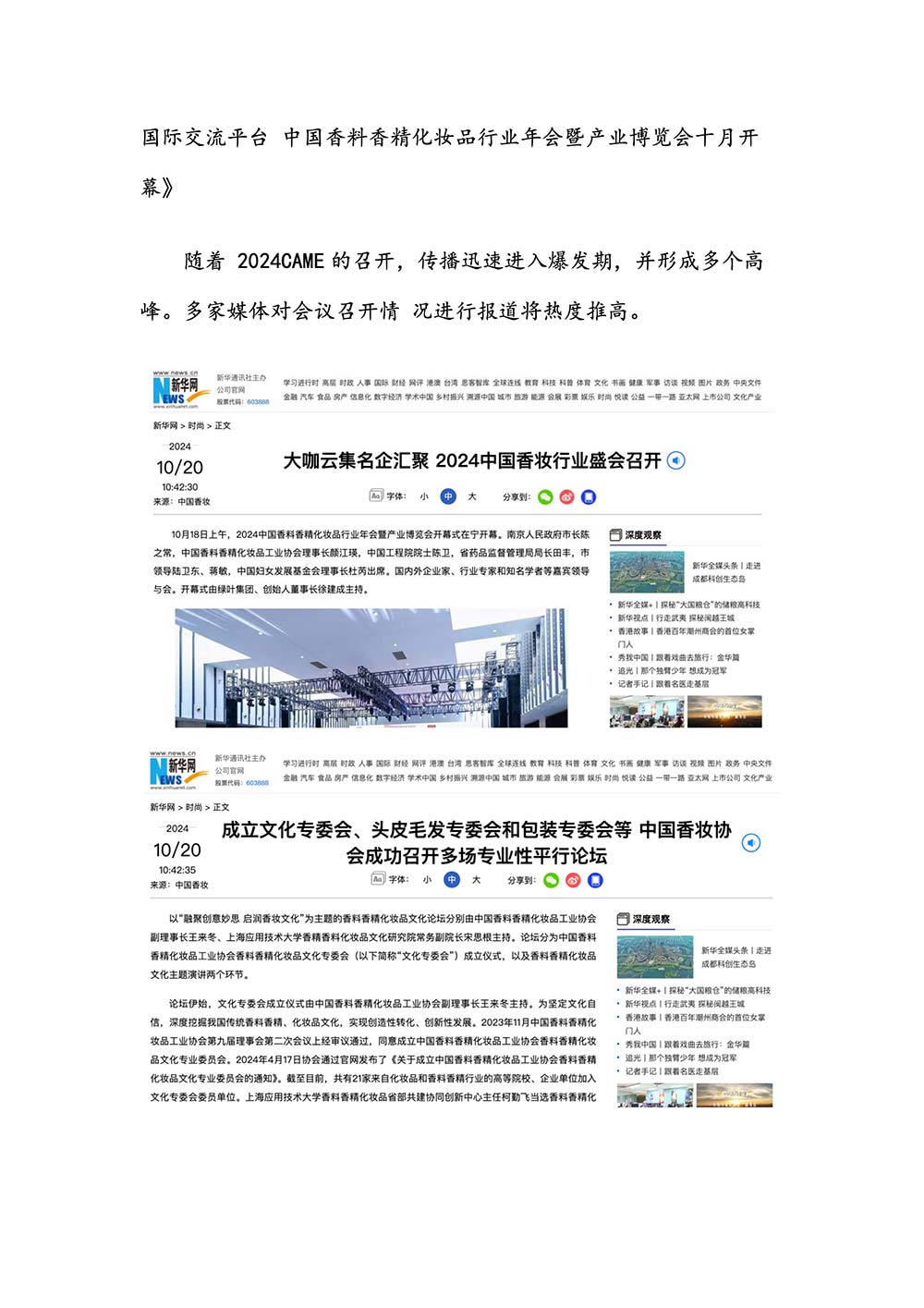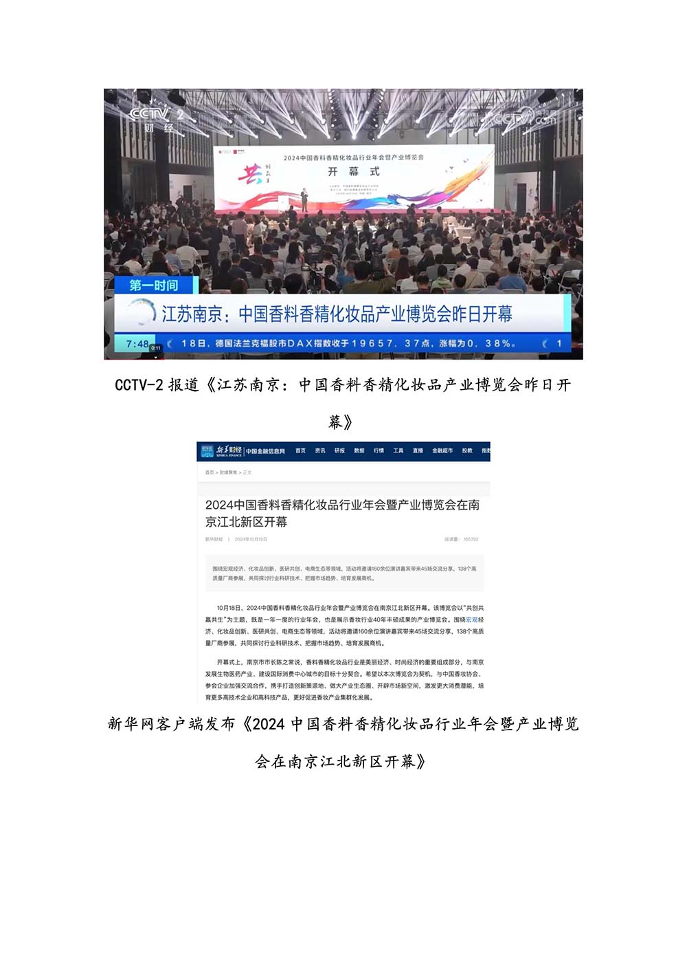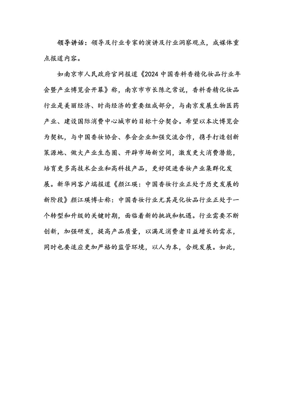 编者按:由中国香料香精化妆品工业协会(以下简称:中国香妆协会)主办的2024中国香料香精化妆品行业年会暨产业博览会是一个高品质、高规格、高精尖的行业盛会,于2024年10月18日-19日在南京成功举办,得到了政府、企业、专家学者、媒体机构和社会各界人士的极大关注和认可。众多国际组织和行业人士也参加了此次盛会,并给予高度评价。同时,包括新华网(新华社主办)、央视频(中央广播电视总台主办)、人民日报社人民网•人民健康等三大央媒在内的权威党政媒体、地方媒体、财经媒体、行业媒体等在内的诸多媒体都对此次盛会进行了报道。