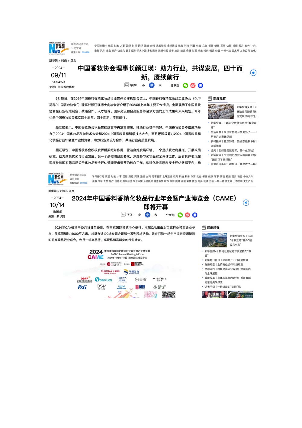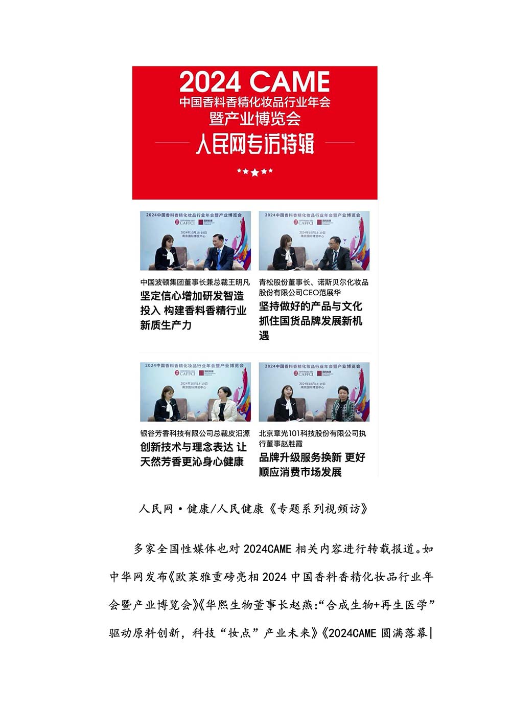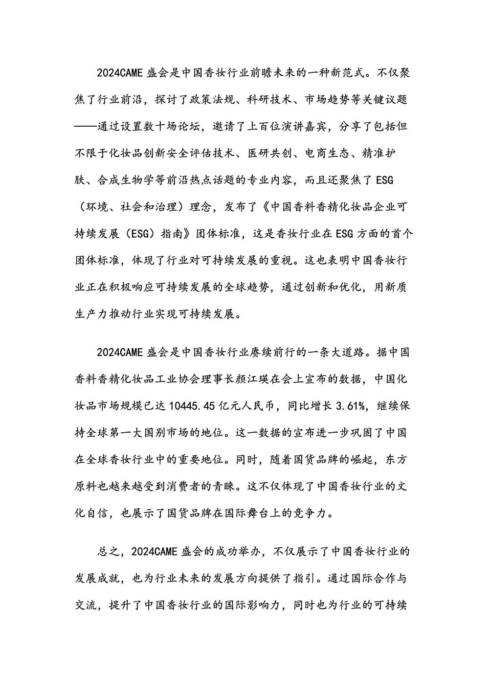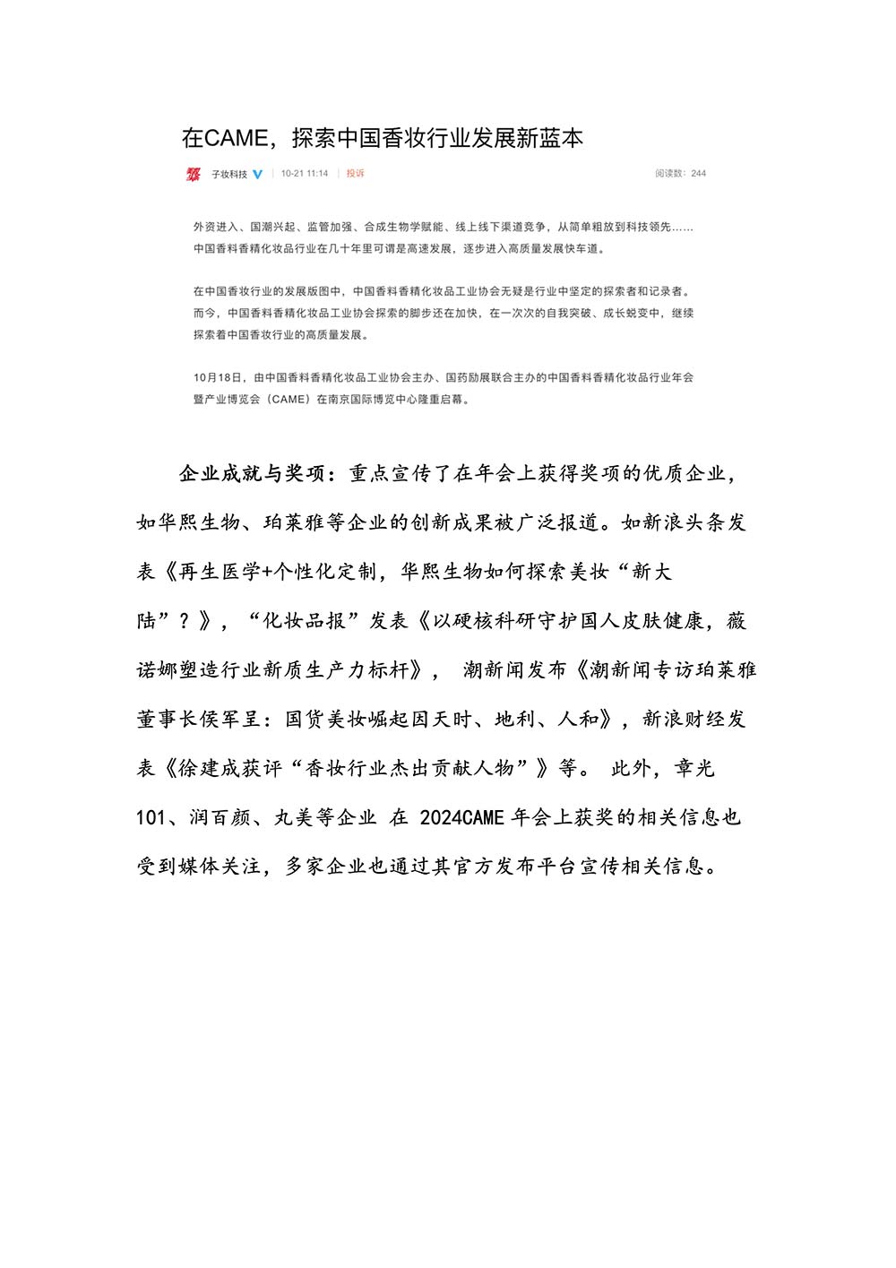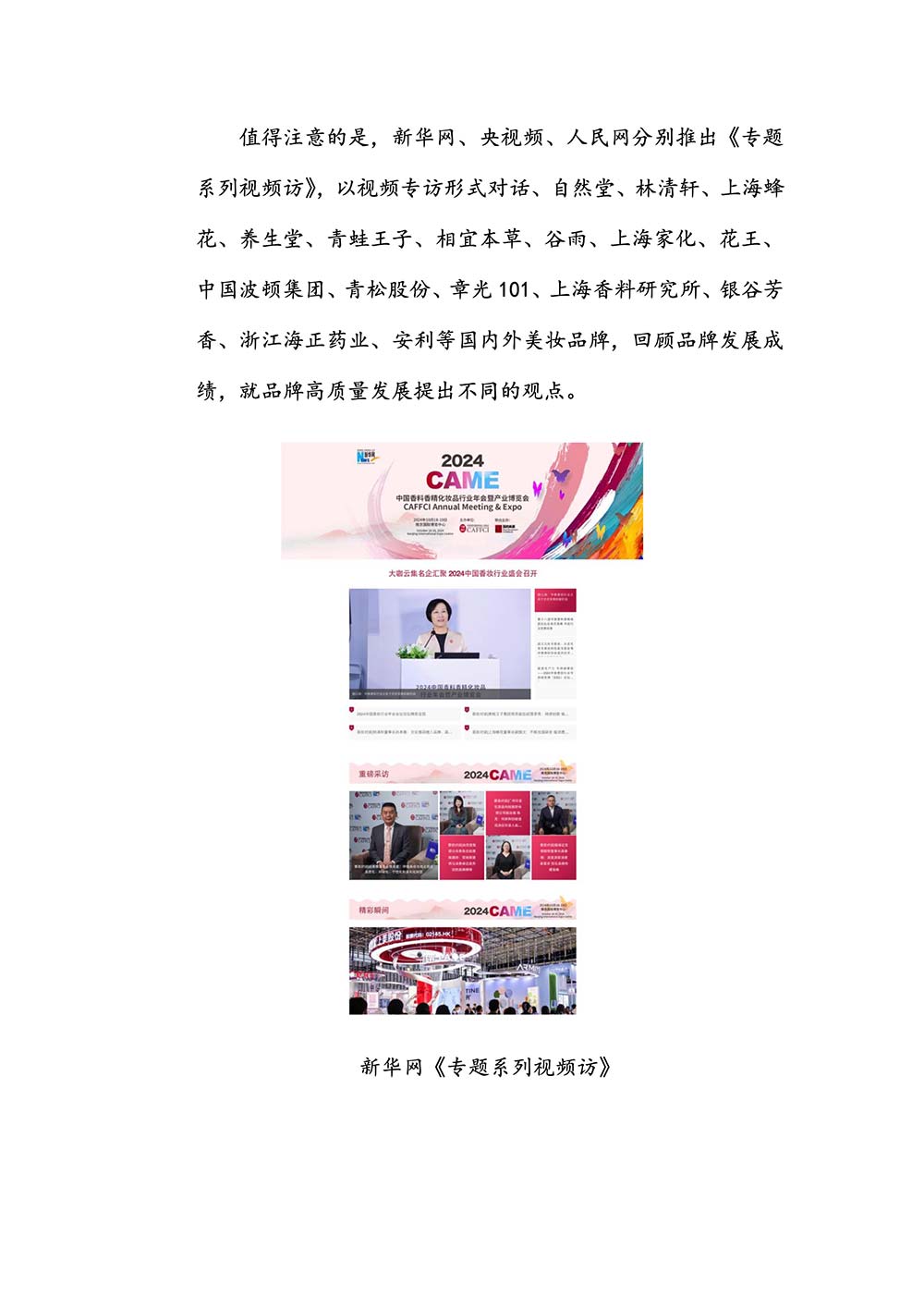 编者按:由中国香料香精化妆品工业协会(以下简称:中国香妆协会)主办的2024中国香料香精化妆品行业年会暨产业博览会是一个高品质、高规格、高精尖的行业盛会,于2024年10月18日-19日在南京成功举办,得到了政府、企业、专家学者、媒体机构和社会各界人士的极大关注和认可。众多国际组织和行业人士也参加了此次盛会,并给予高度评价。同时,包括新华网(新华社主办)、央视频(中央广播电视总台主办)、人民日报社人民网•人民健康等三大央媒在内的权威党政媒体、地方媒体、财经媒体、行业媒体等在内的诸多媒体都对此次盛会进行了报道。