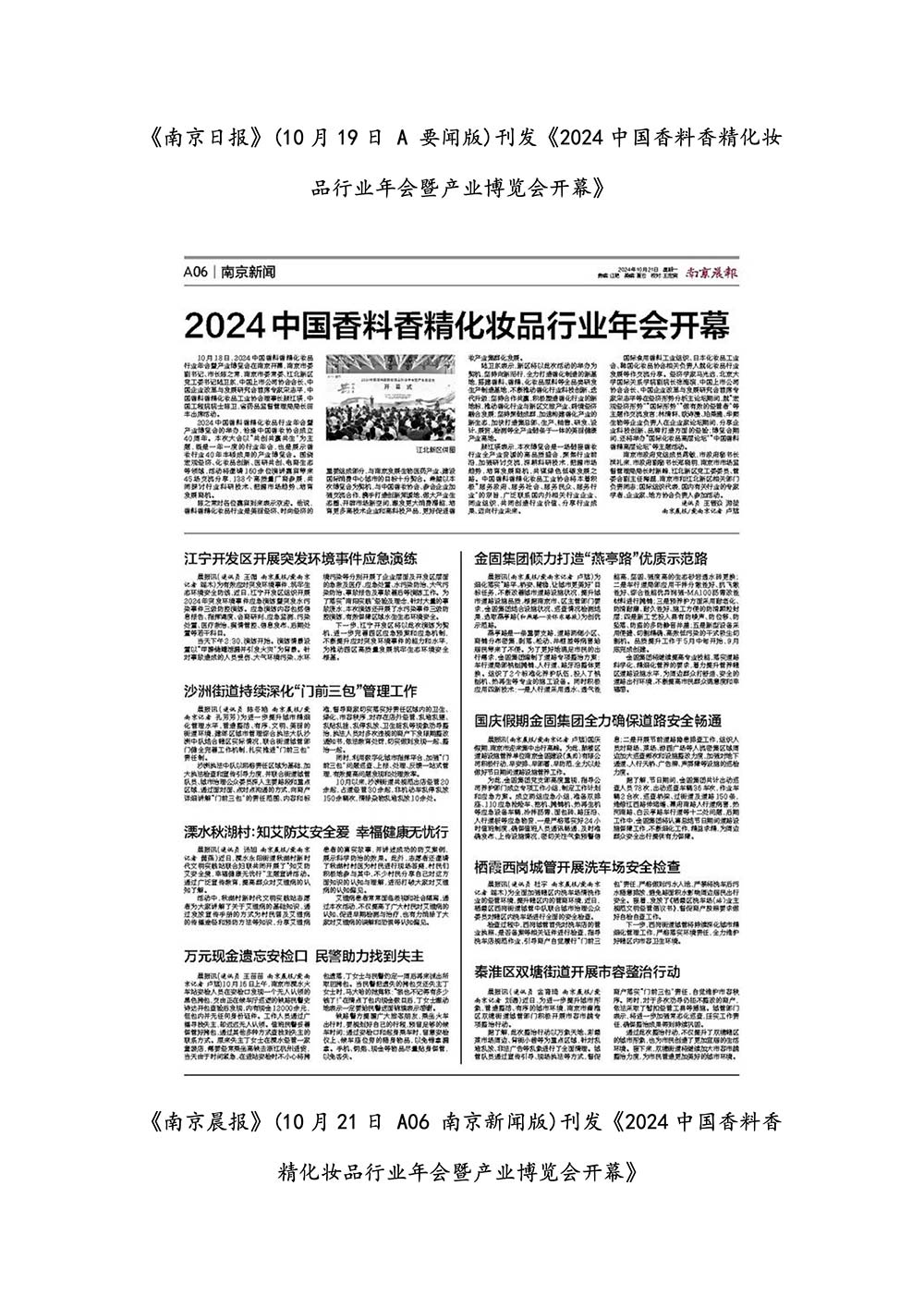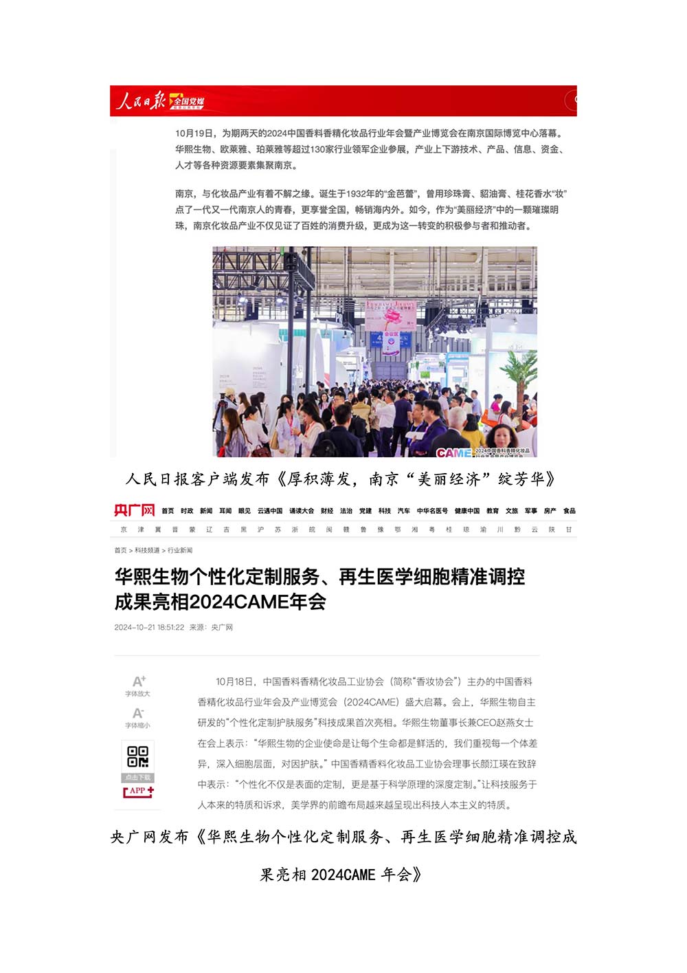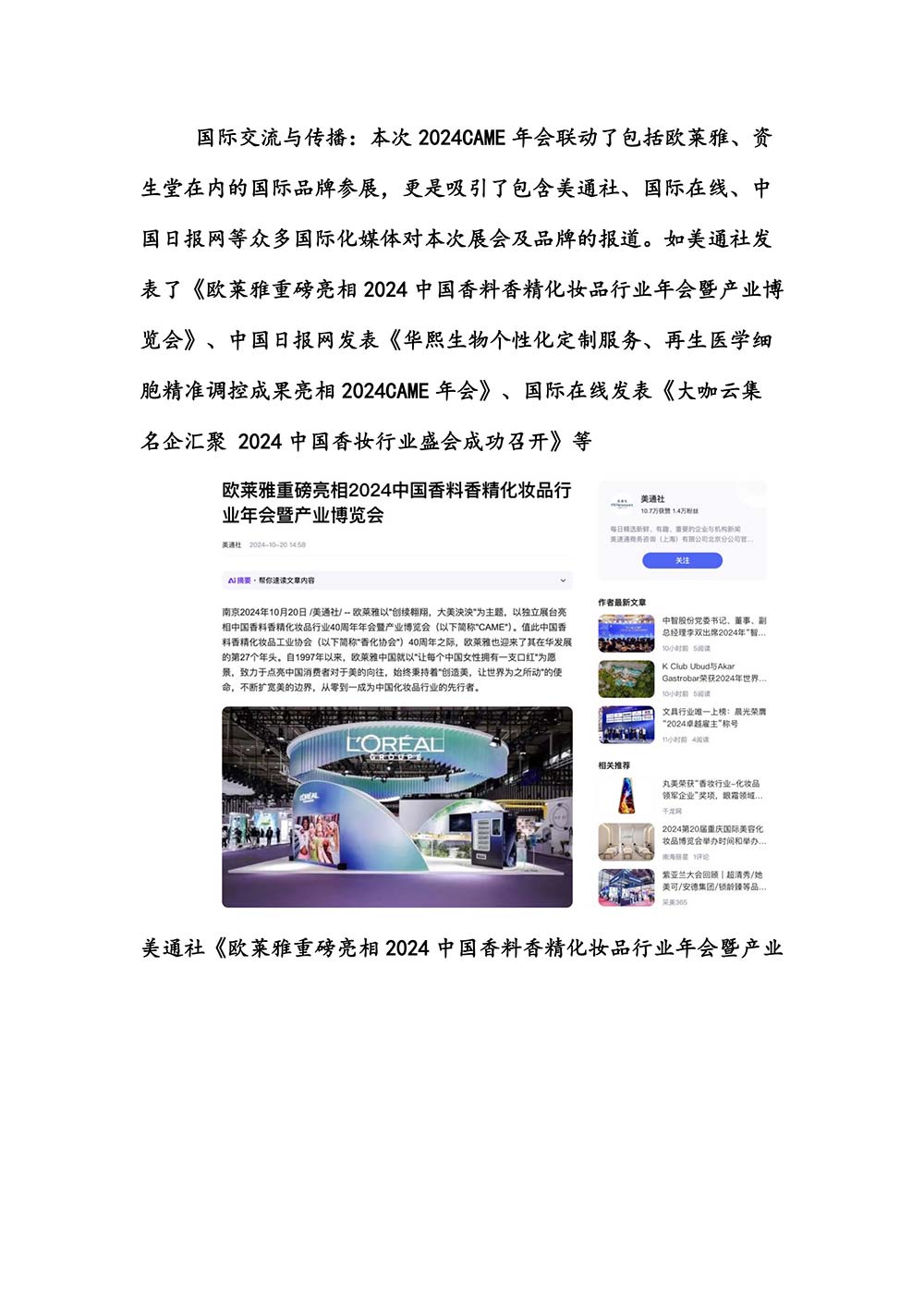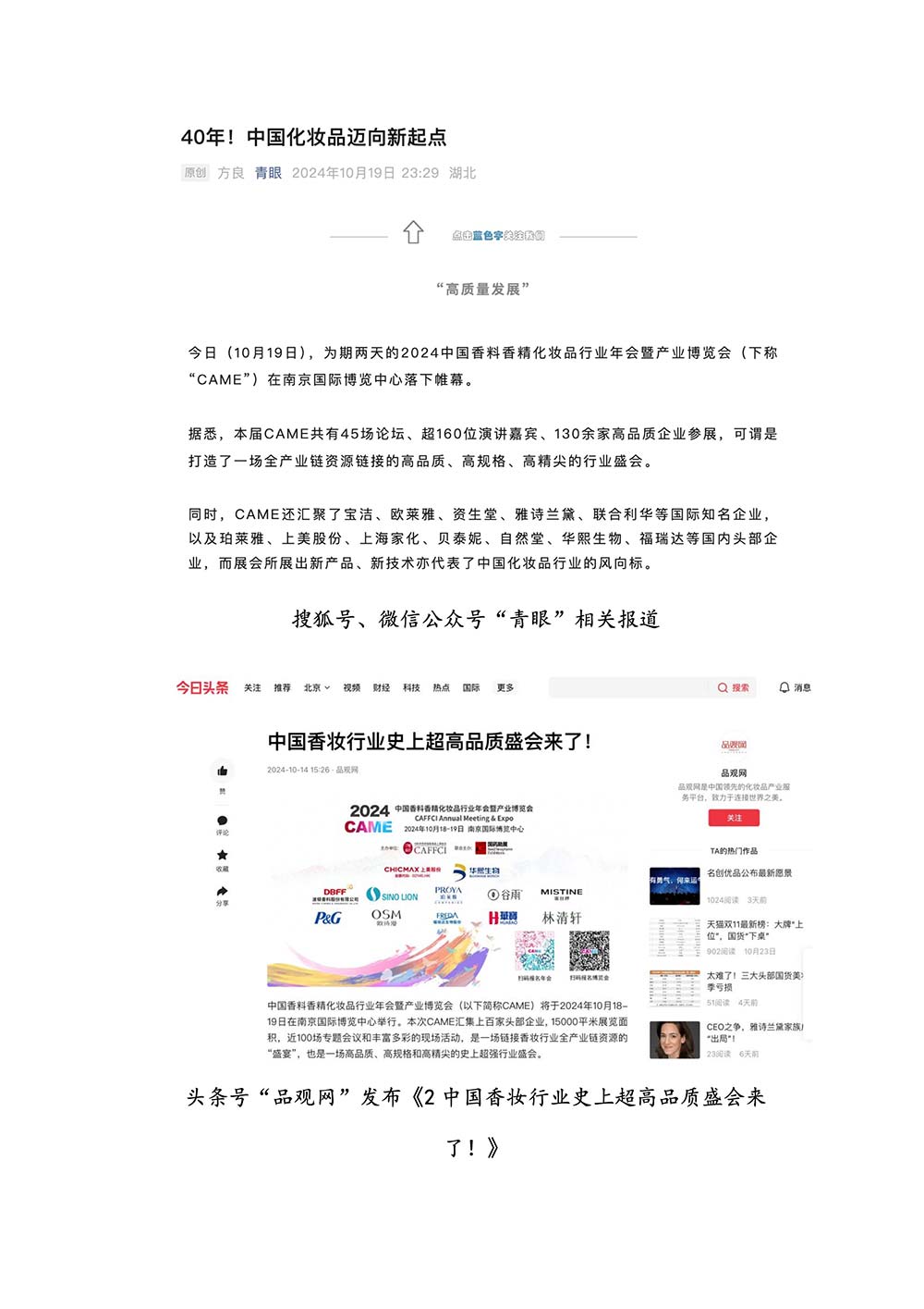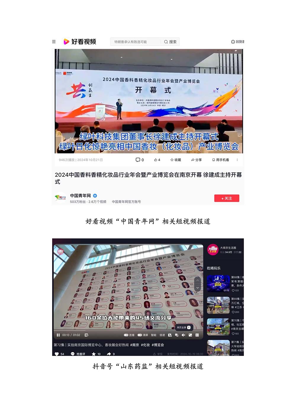 编者按:由中国香料香精化妆品工业协会(以下简称:中国香妆协会)主办的2024中国香料香精化妆品行业年会暨产业博览会是一个高品质、高规格、高精尖的行业盛会,于2024年10月18日-19日在南京成功举办,得到了政府、企业、专家学者、媒体机构和社会各界人士的极大关注和认可。众多国际组织和行业人士也参加了此次盛会,并给予高度评价。同时,包括新华网(新华社主办)、央视频(中央广播电视总台主办)、人民日报社人民网•人民健康等三大央媒在内的权威党政媒体、地方媒体、财经媒体、行业媒体等在内的诸多媒体都对此次盛会进行了报道。