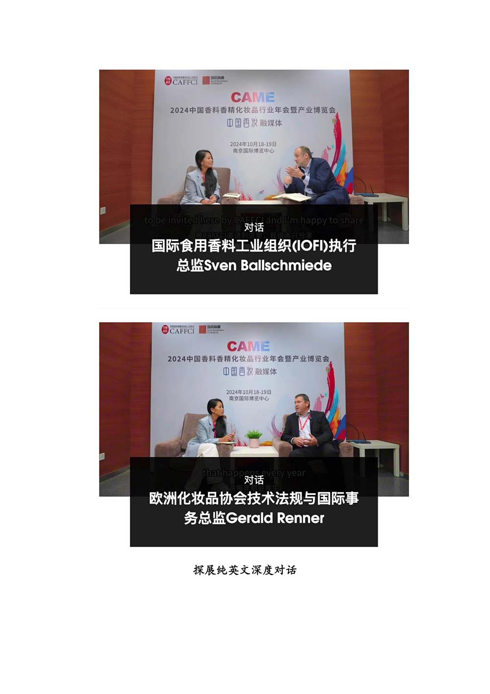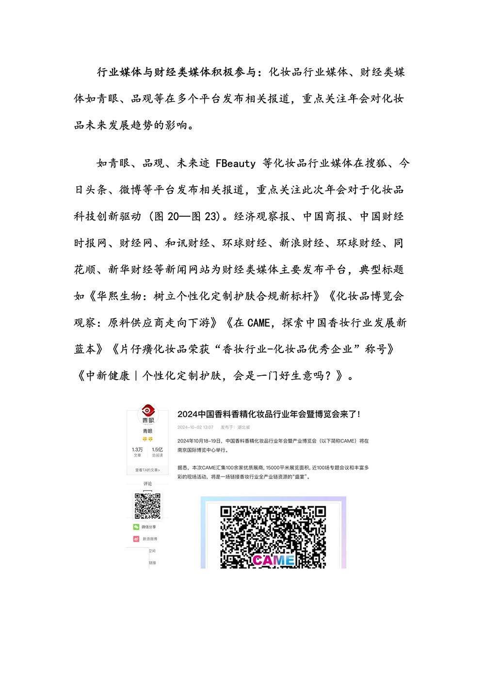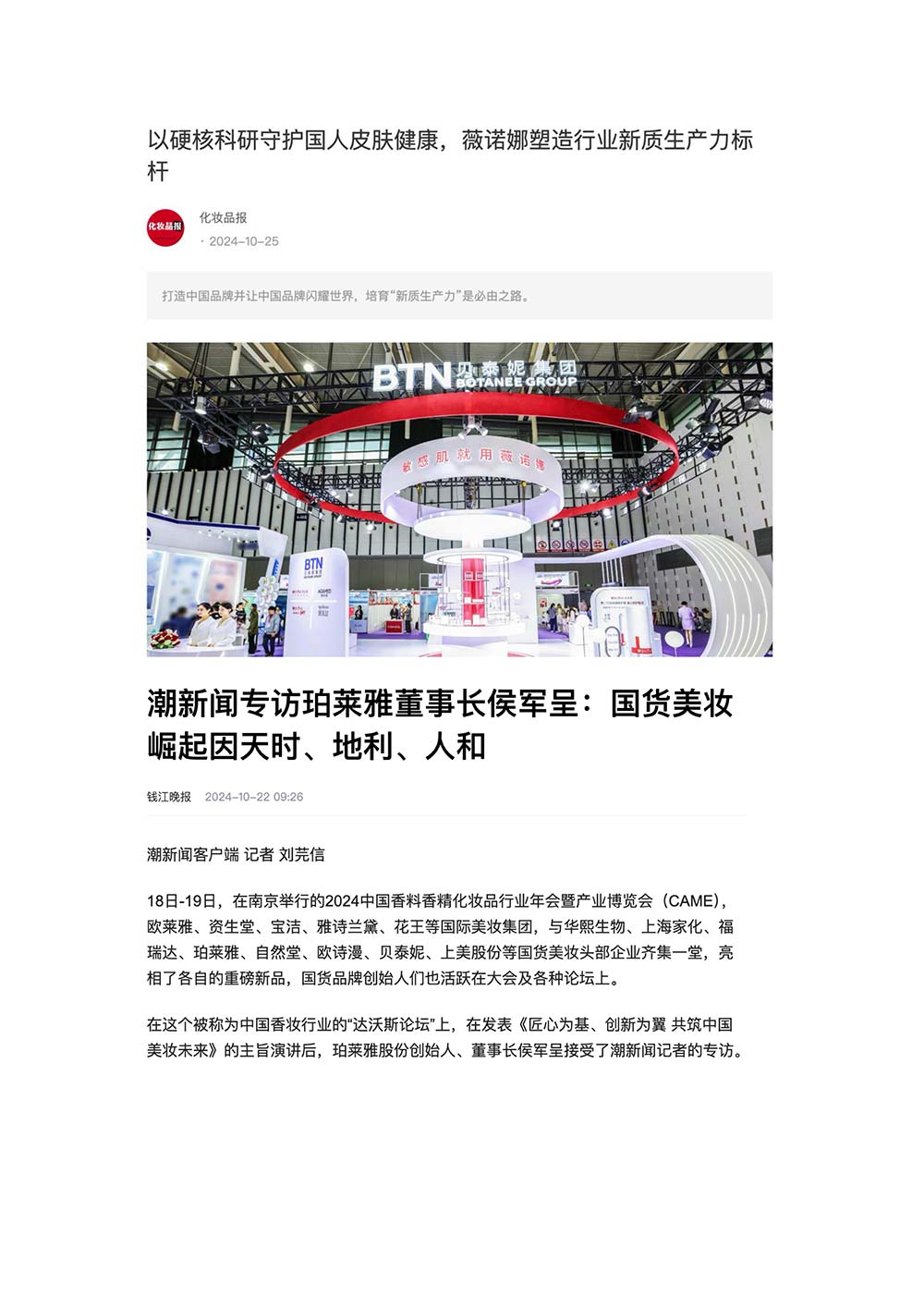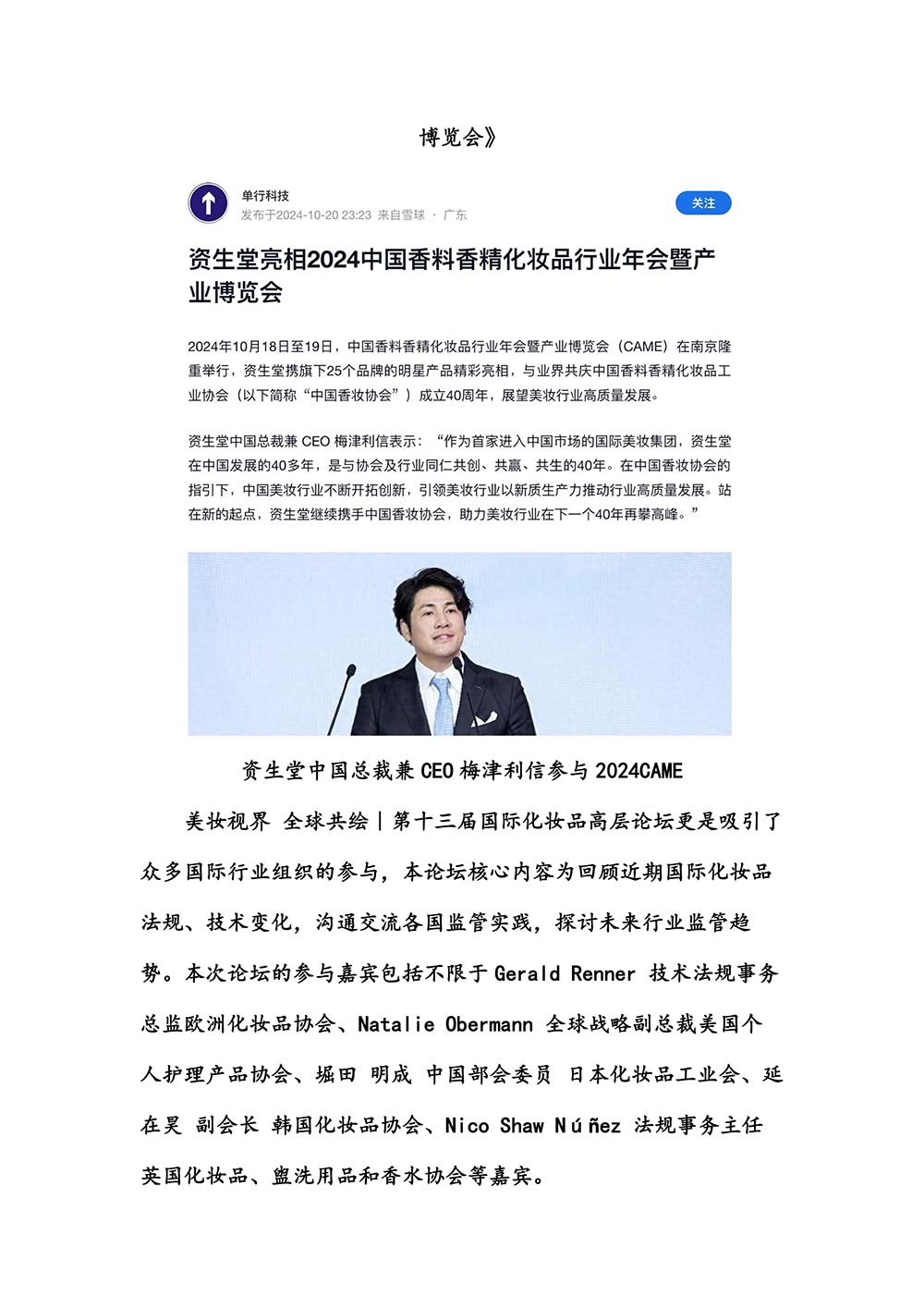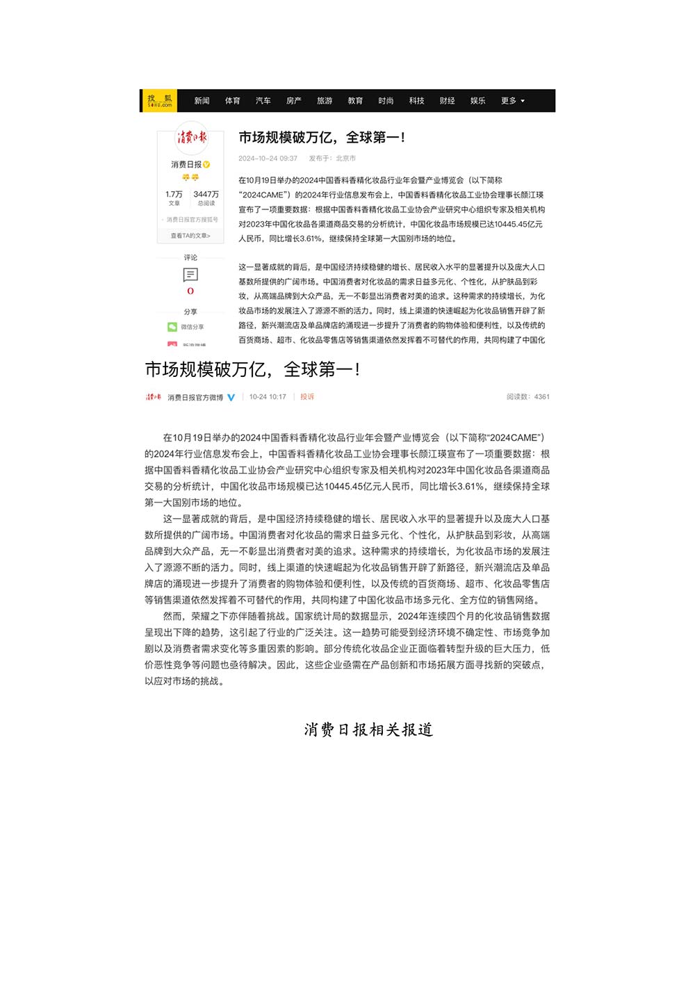 编者按:由中国香料香精化妆品工业协会(以下简称:中国香妆协会)主办的2024中国香料香精化妆品行业年会暨产业博览会是一个高品质、高规格、高精尖的行业盛会,于2024年10月18日-19日在南京成功举办,得到了政府、企业、专家学者、媒体机构和社会各界人士的极大关注和认可。众多国际组织和行业人士也参加了此次盛会,并给予高度评价。同时,包括新华网(新华社主办)、央视频(中央广播电视总台主办)、人民日报社人民网•人民健康等三大央媒在内的权威党政媒体、地方媒体、财经媒体、行业媒体等在内的诸多媒体都对此次盛会进行了报道。
