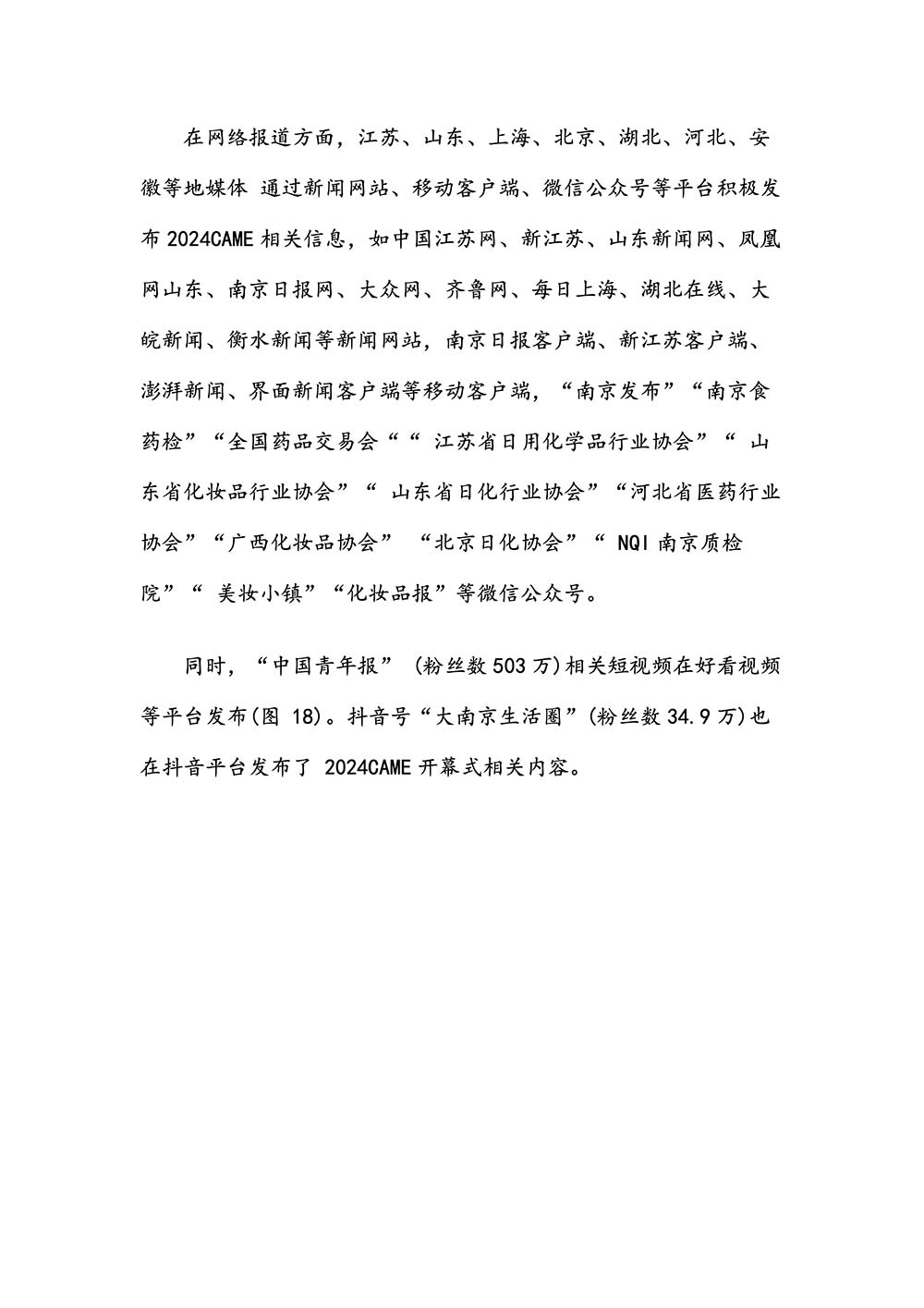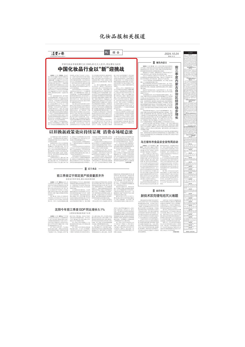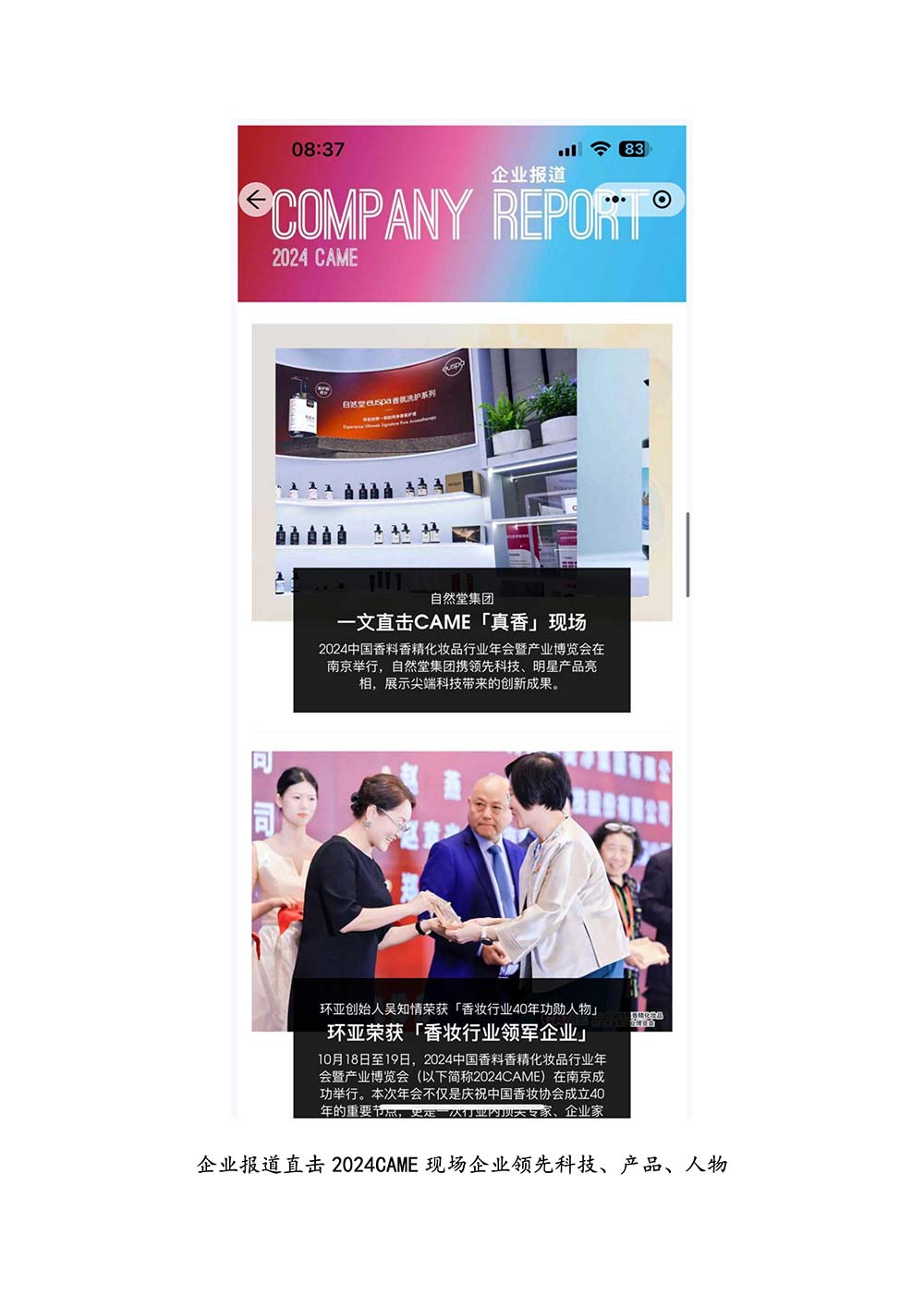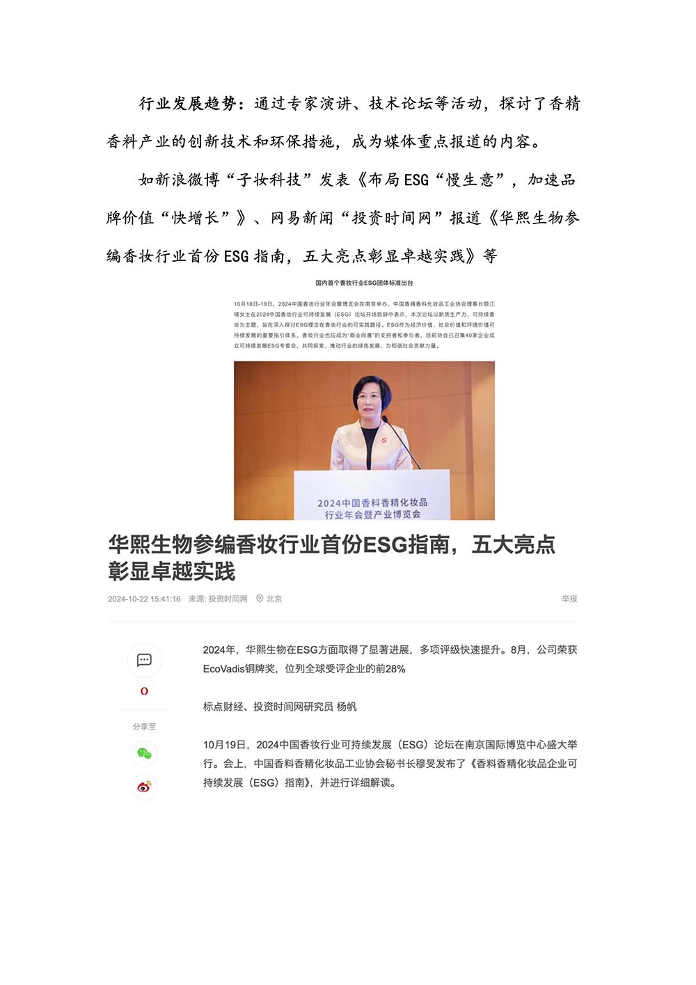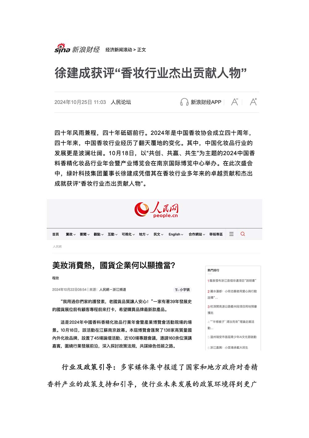 编者按:由中国香料香精化妆品工业协会(以下简称:中国香妆协会)主办的2024中国香料香精化妆品行业年会暨产业博览会是一个高品质、高规格、高精尖的行业盛会,于2024年10月18日-19日在南京成功举办,得到了政府、企业、专家学者、媒体机构和社会各界人士的极大关注和认可。众多国际组织和行业人士也参加了此次盛会,并给予高度评价。同时,包括新华网(新华社主办)、央视频(中央广播电视总台主办)、人民日报社人民网•人民健康等三大央媒在内的权威党政媒体、地方媒体、财经媒体、行业媒体等在内的诸多媒体都对此次盛会进行了报道。