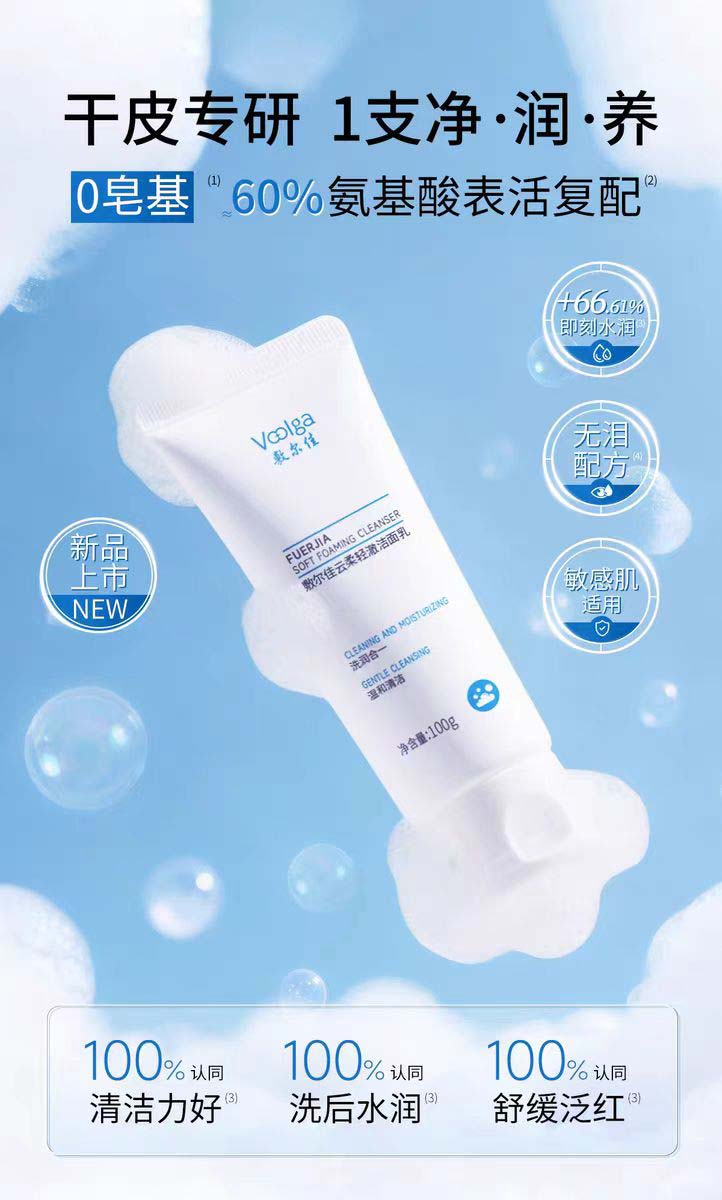 云朵清洁系列云柔轻澈洁面乳专为破解干敏肌 “想清洁又怕伤屏障” 的难题。其核心采用 8 重表活科学复配体系 —— 以温和氨基酸表活为基底,复配天然表活茶籽提取物,搭配 4 重保湿因子(AQUAXYL™、透明质酸钠等)和2重舒缓因子(悦肤宁、龙胆双因子抗敏素),构建“清洁 - 保湿 - 舒缓”三重洗护体验。通过温和有效的清洁与保湿舒缓因子的协同,真正实现 “边洗边养”,令肌肤洗后水润不紧绷,成为干敏肌和换季敏感期清洁的 “安心之选”。