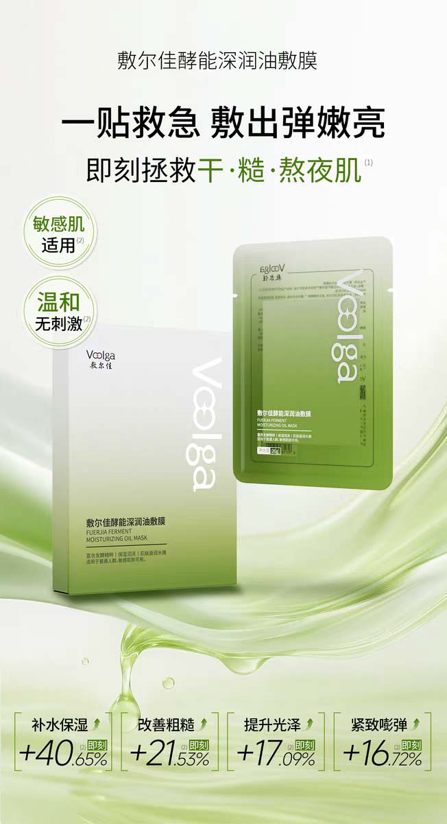 酵能深润油敷膜打破 “以油养肤 = 油腻闷痘” 的刻板印象。其核心是高浓度发酵产物(乳酸杆菌、二裂酵母、大米发酵产物):乳酸杆菌维稳肌肤状态,二裂酵母修护屏障,大米发酵产物深度保湿;再通过双层卵磷脂微乳化技术,将油相拆分为微米级颗粒,搭配 141 倍载液量的日本进口雪纤绒膜布,实现 “久敷不洗” 的清爽体验。熬夜后使用,既能通过发酵产物舒缓泛红,又能靠微乳化油脂深层滋养,敏感肌也能安心享受 “以油养肤”。