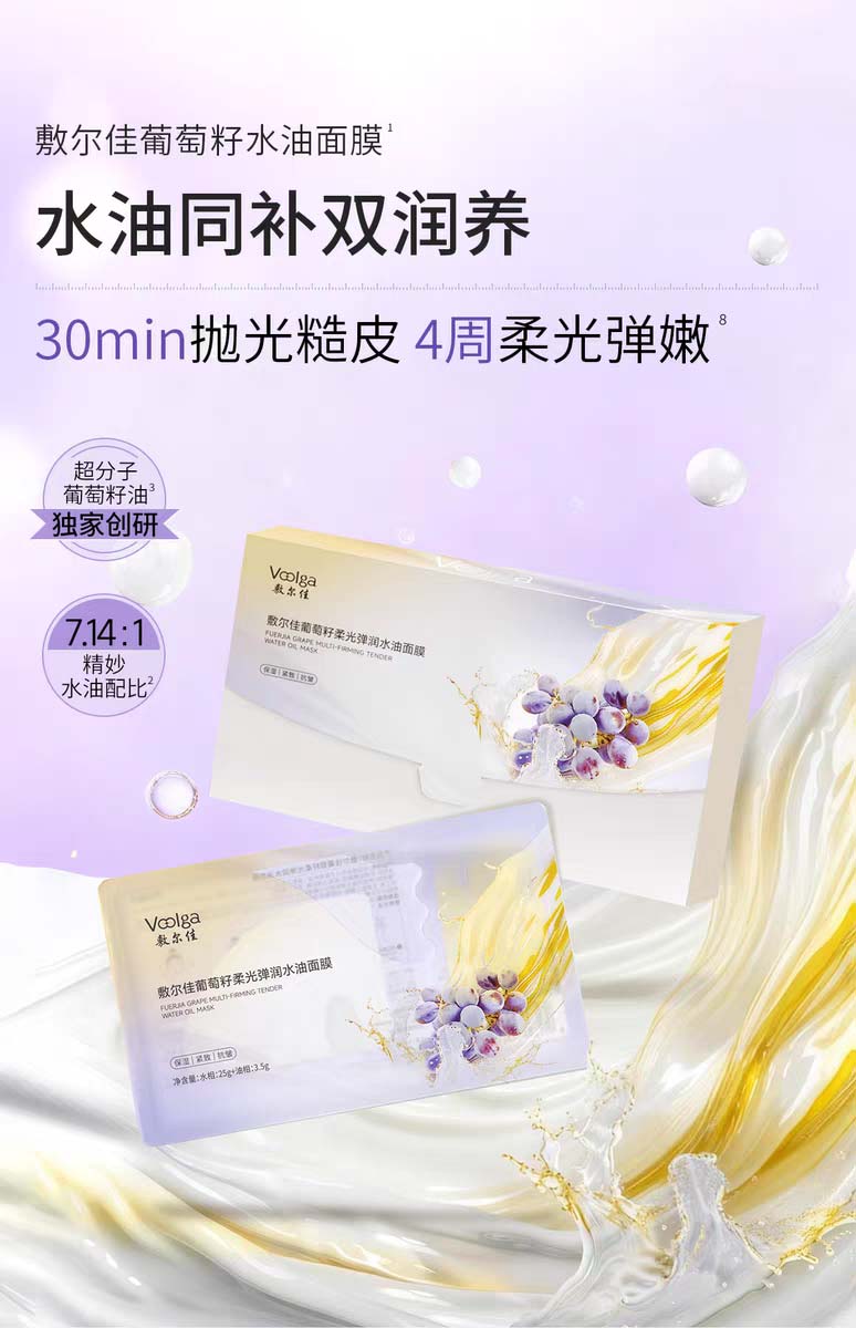 葡萄籽柔光弹润水油面膜则以 “超分子葡萄籽油” 为核心突破抗衰紧致需求。该成分是与高校联合研发,通过双重超分子技术提升渗透力与稳定性,既能增强葡萄籽油的抗氧化、促胶原功效,又能降低油腻感;搭配 “水仓8重御老因子(乙酰基六肽 - 8、类蛇毒肽等)+油仓7重油润精萃”