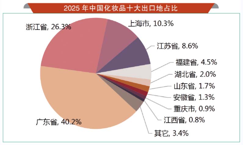 近期,一场聚焦化妆品进出口高质量发展的政策宣讲会在广州市黄埔区“南方美谷”产业园举行,核心是解读今年1月海关总署批复的《关于支持广州市“国际美湾”进出口化妆品产业高质量发展九条措施》。放眼全国,化妆品产业已形成多点开花的集聚格局,并直接反映在出口数据上:2025年,我国化妆品前五大出口省市牢牢占据近九成出口份额,广东、浙江、上海、江苏、福建的集聚效应明显,已形成“白云美湾”“东方美谷