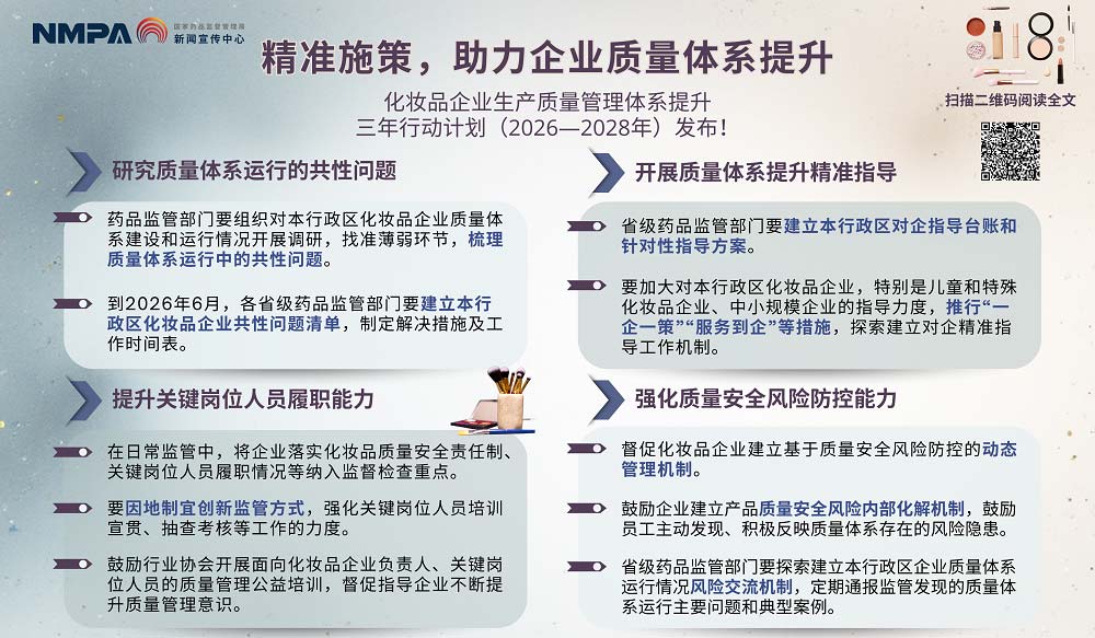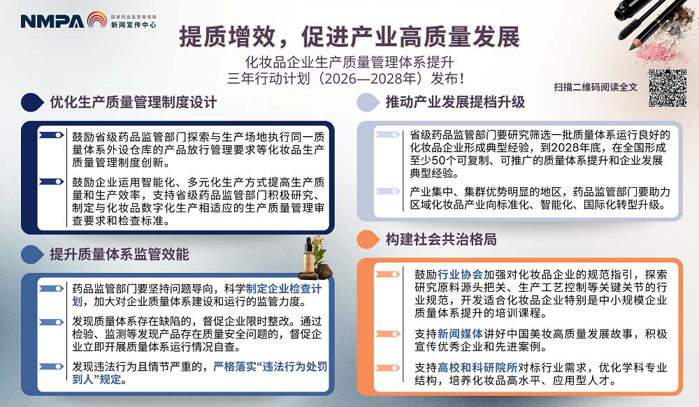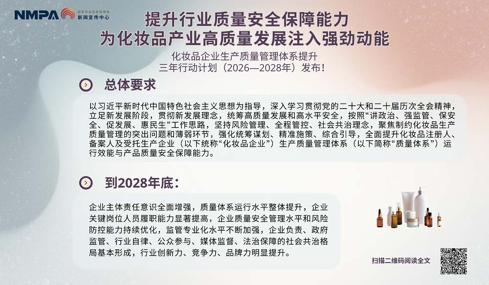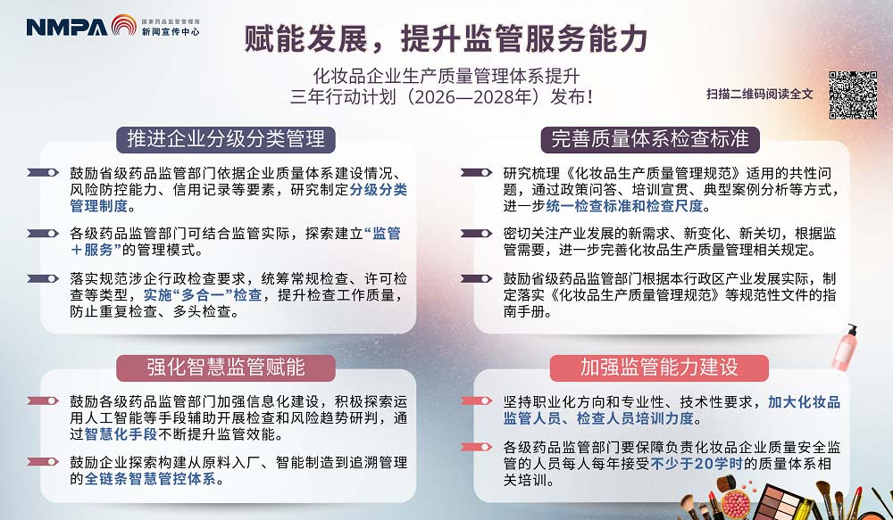 2026年起,国家药监局实施化妆品企业生产质量管理体系提升三年行动计划(2026—2028)。计划聚焦企业质量薄弱环节,通过调研共性问题、精准帮扶企业、强化人员能力、筑牢风险防控等举措,从制度、监管、产业、共治四维度发力,优化分级分类管理与智慧监管,要求监管者年参训不少于20学时。目标 2028 年底前,全面提升企业质量水平与监管效能,构建社会共治格局,助力行业高质量发展。